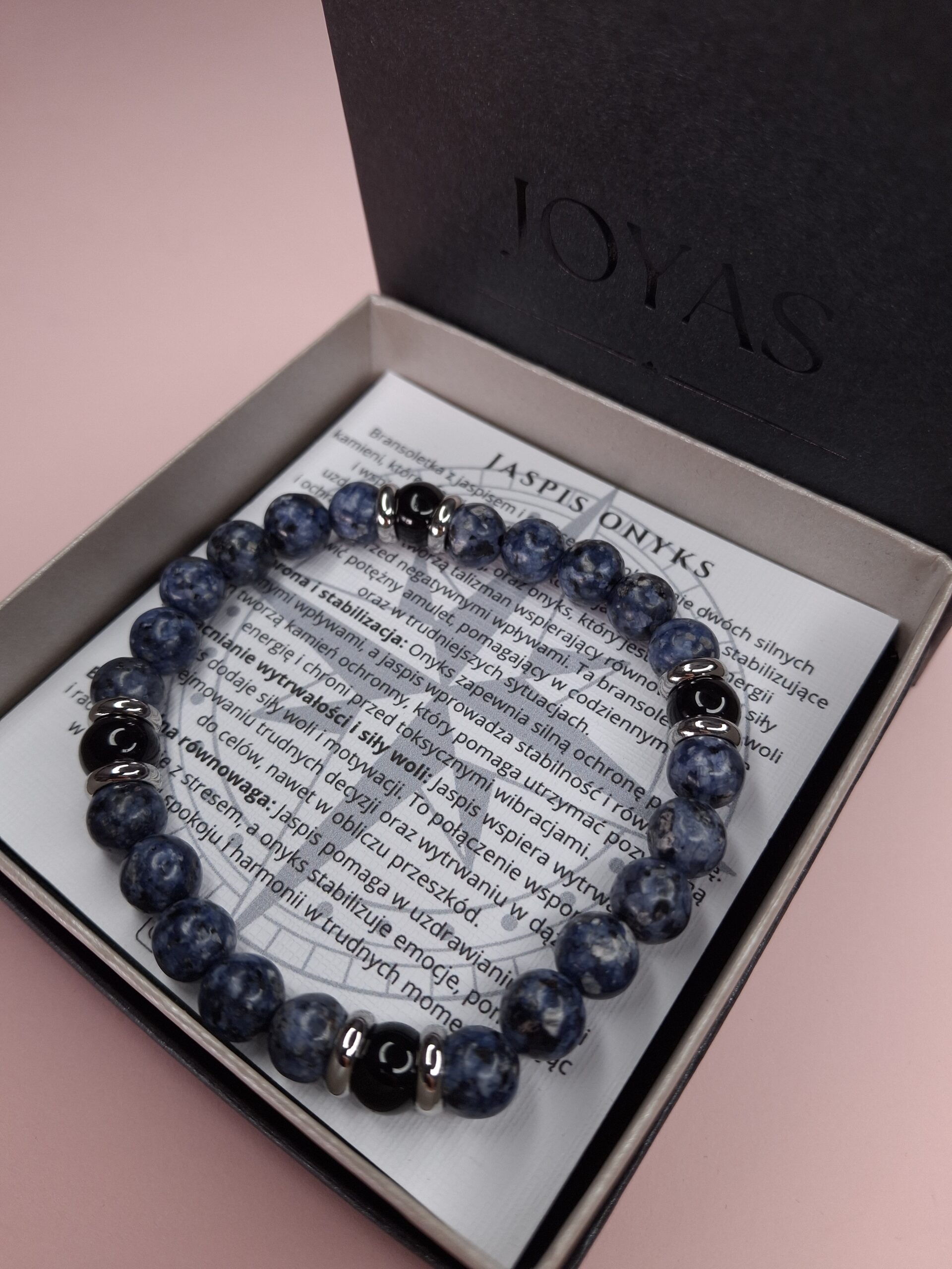 Bransoletka z jaspisem i onyksem to połączenie dwóch silnych kamieni, które oferują wyjątkowe właściwości ochronne, stabilizujące