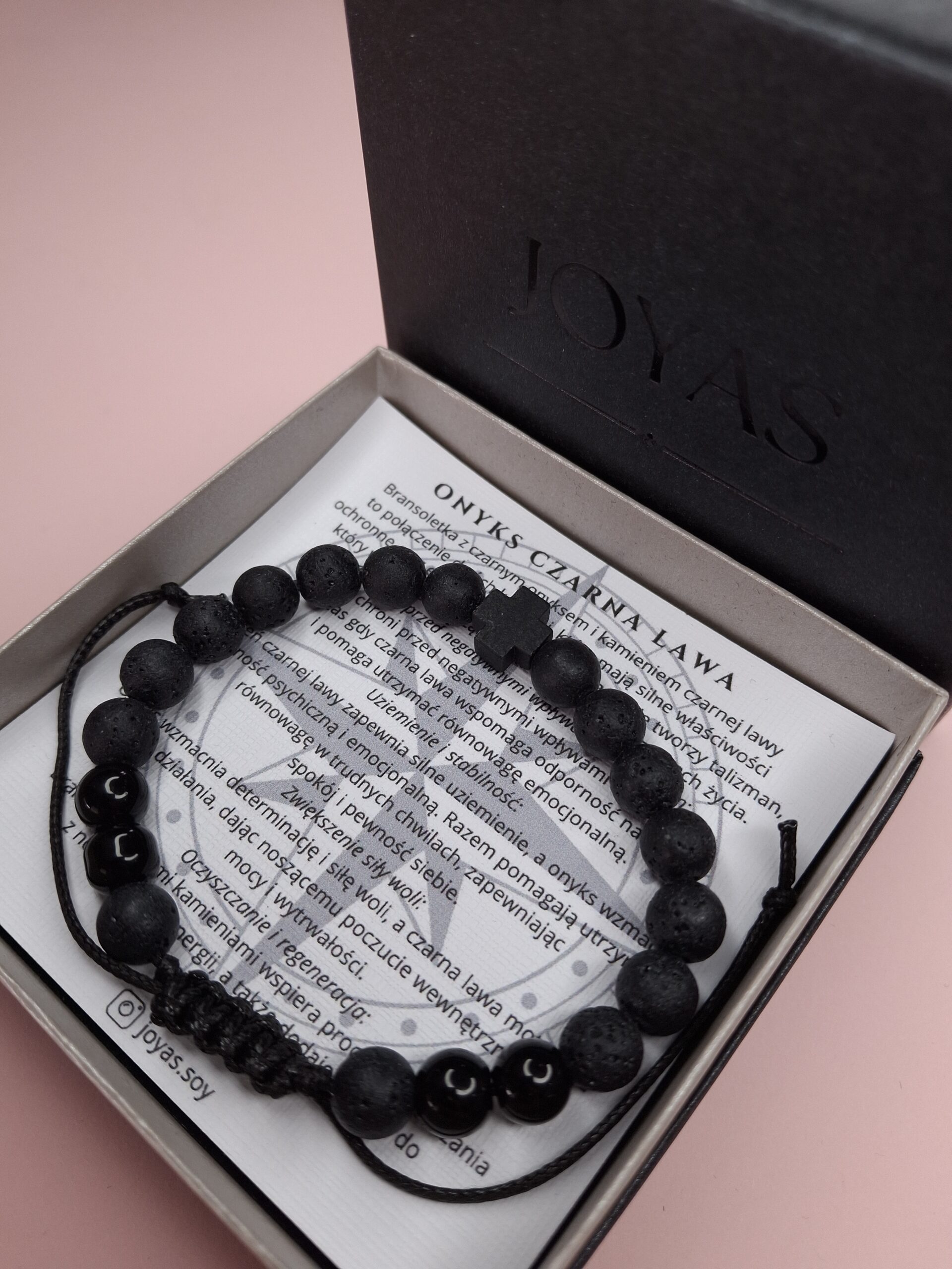 Bransoletka z czarnym onyksem i kamieniem czarnej lawy to połączenie dwóch kamieni, które mają silne właściwości