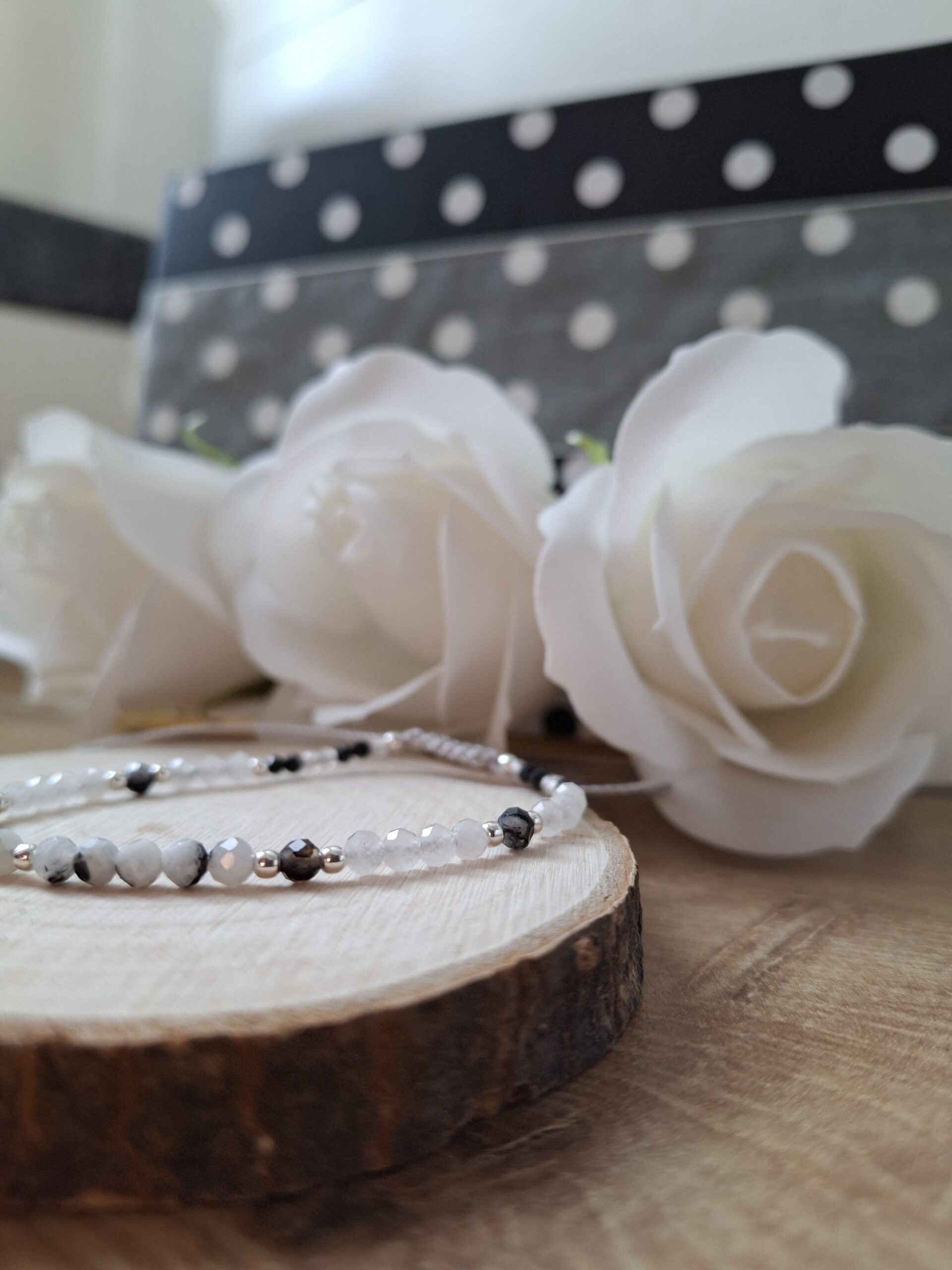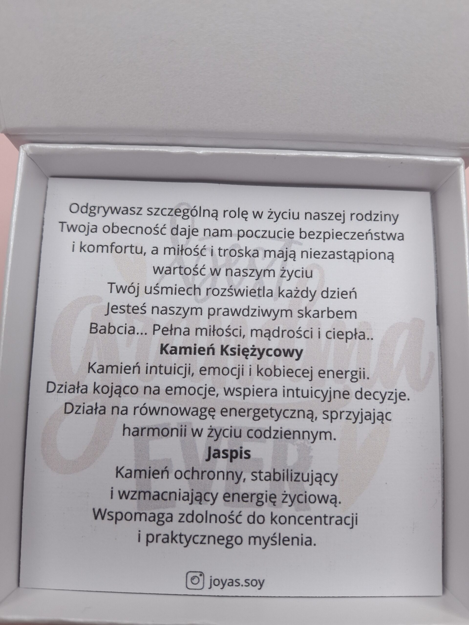 Kamień księżycowy wnosi delikatność i spokój, a jaspis daje siłę i poczucie bezpieczeństwa.