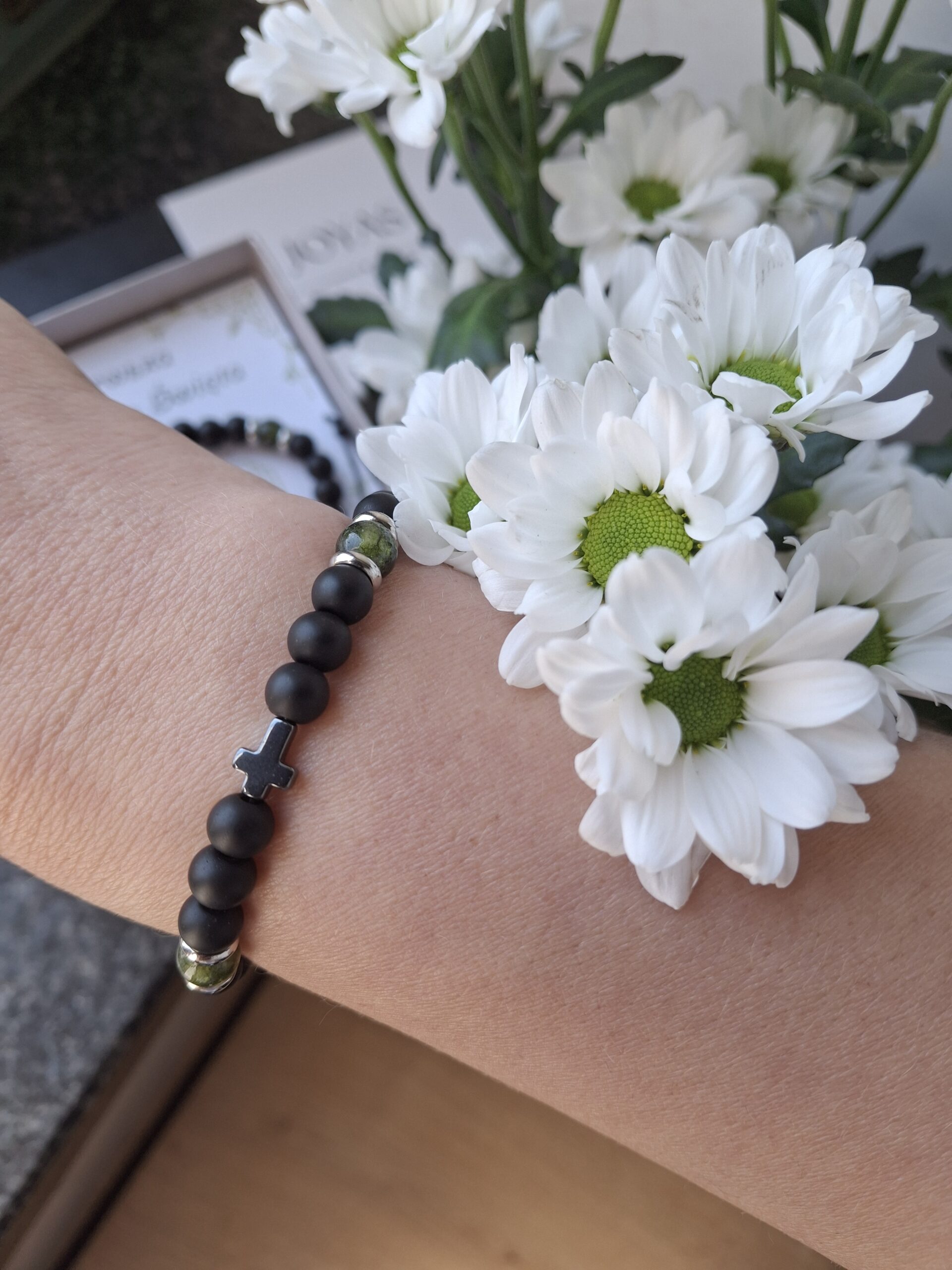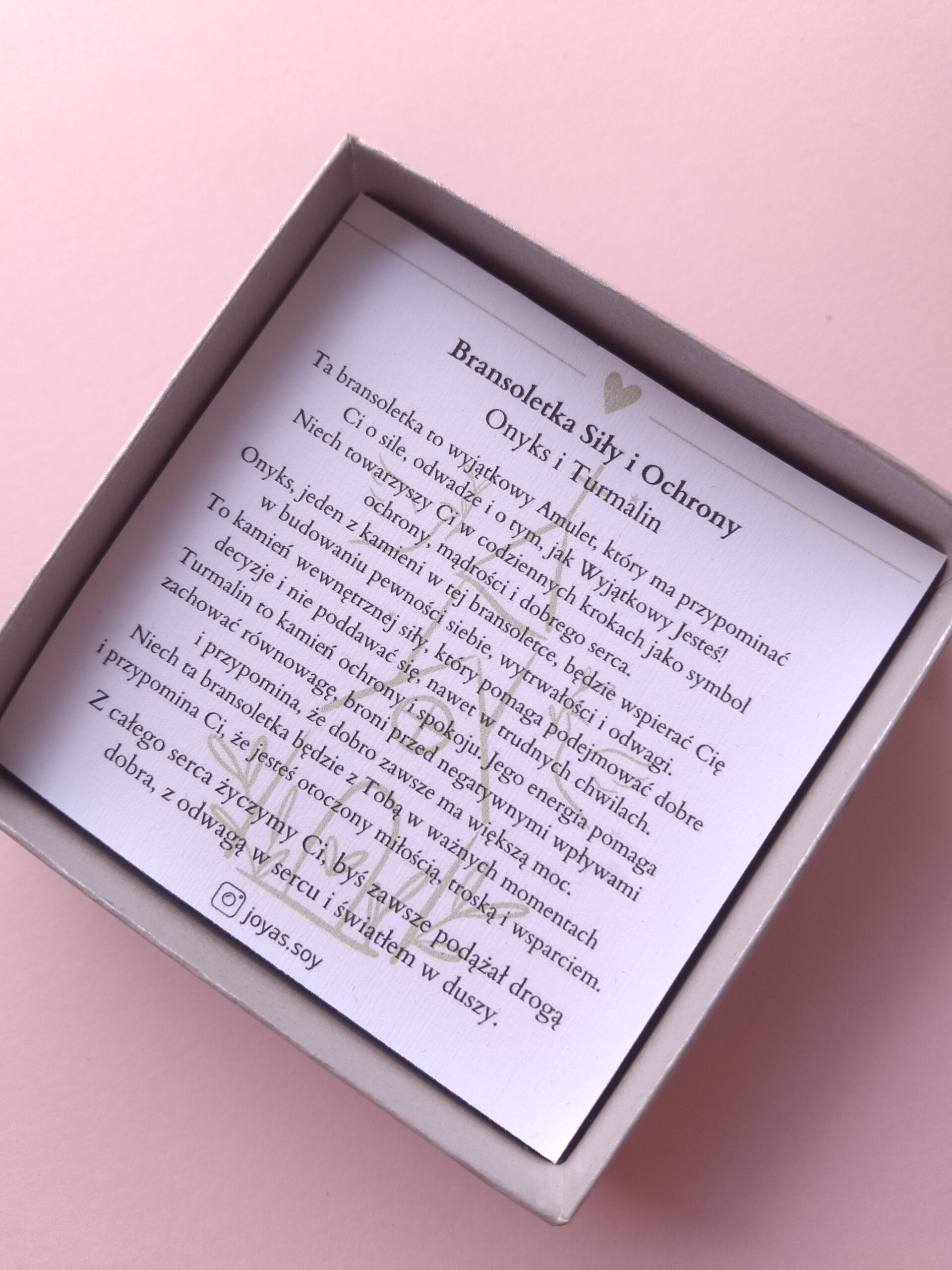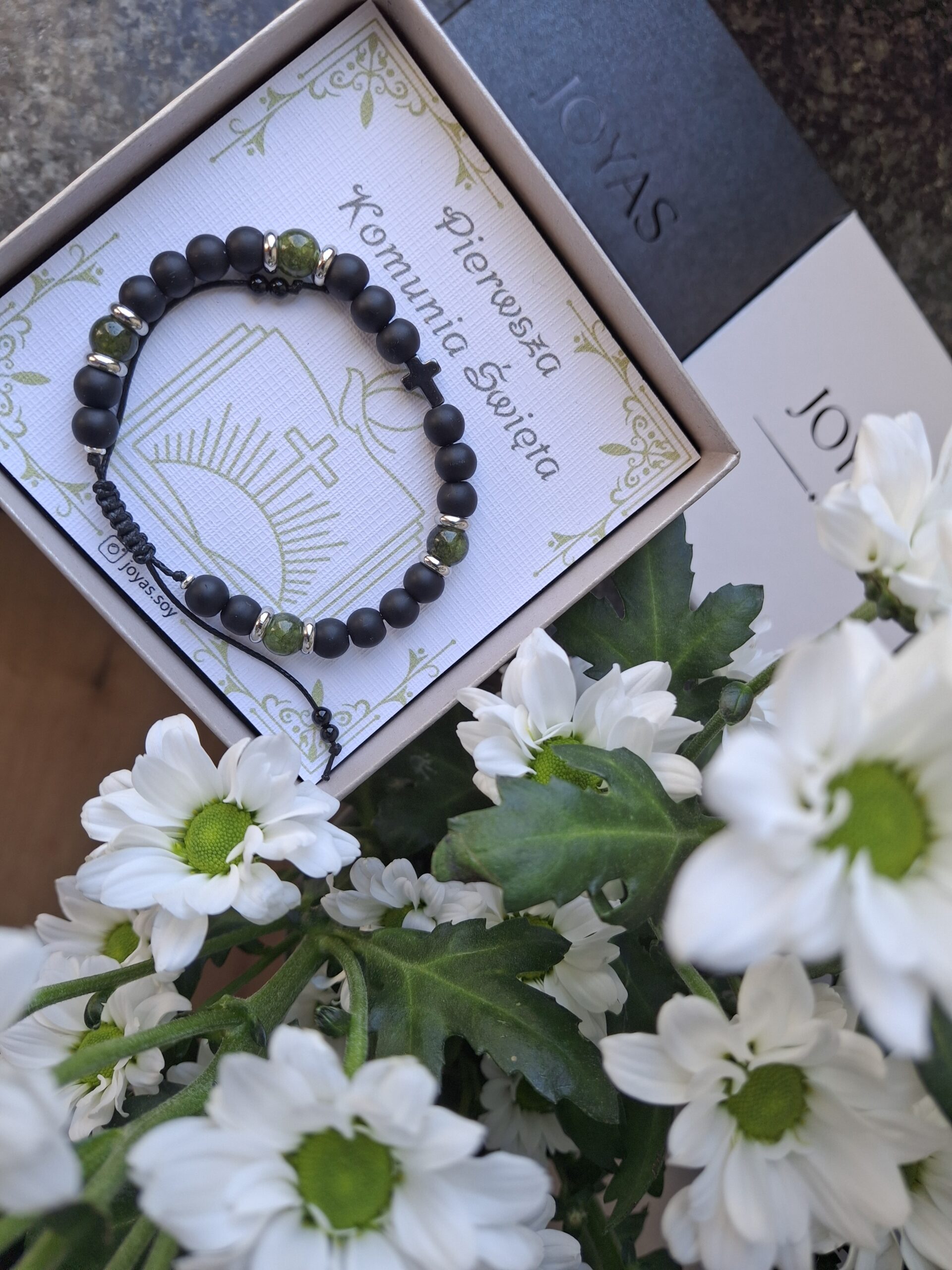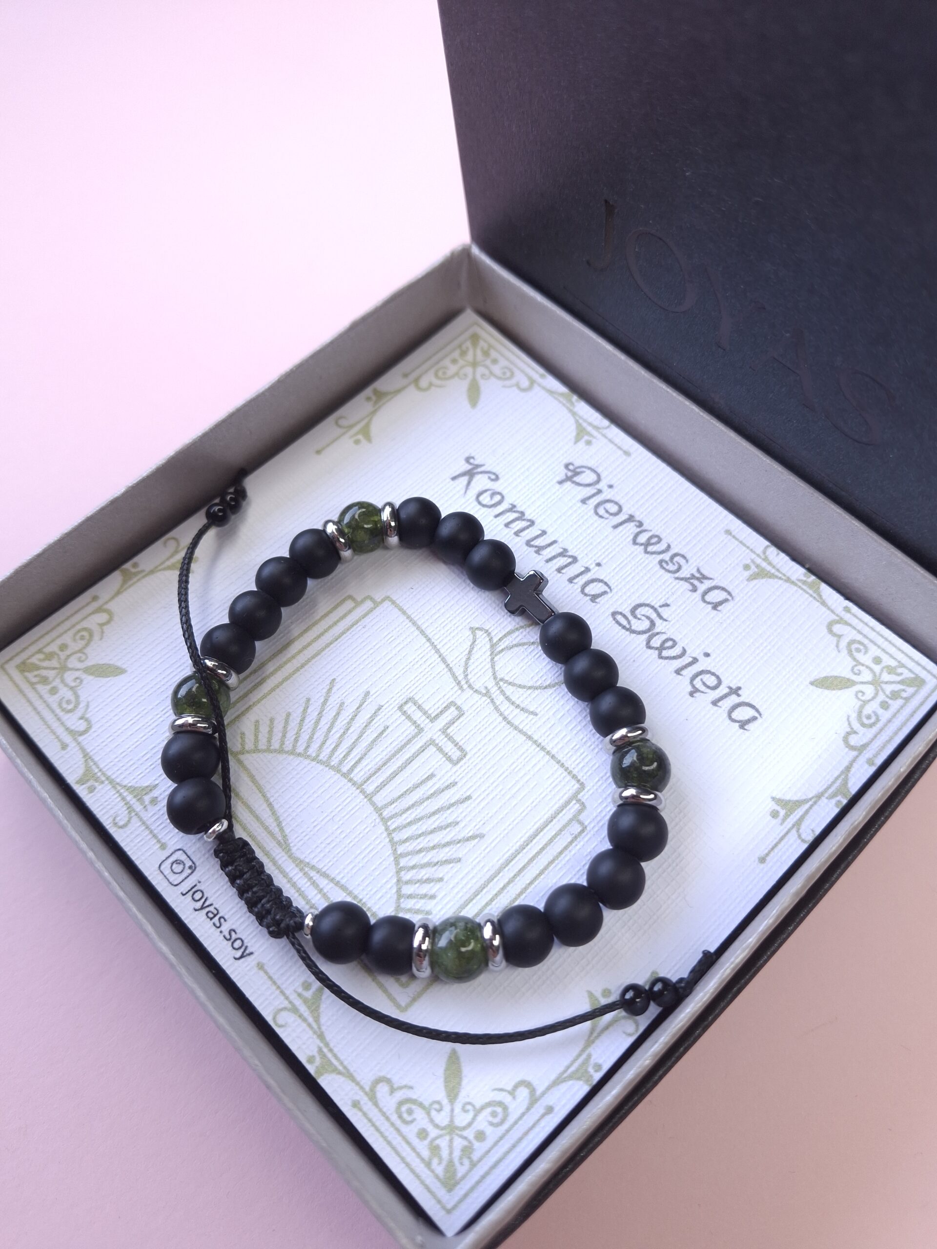 Bransoletka na Komunię Świętą dla chłopca z onyksem i turmalinem – elegancki talizman siły, ochrony i spokoju. Onyks dodaje pewności siebie, wytrwałości i odwagi, a turmalin chroni przed negatywną energią i wspiera wewnętrzną równowagę. Razem tworzą symbol mądrego wzrastania, duchowej ochrony i dobrych wyborów.