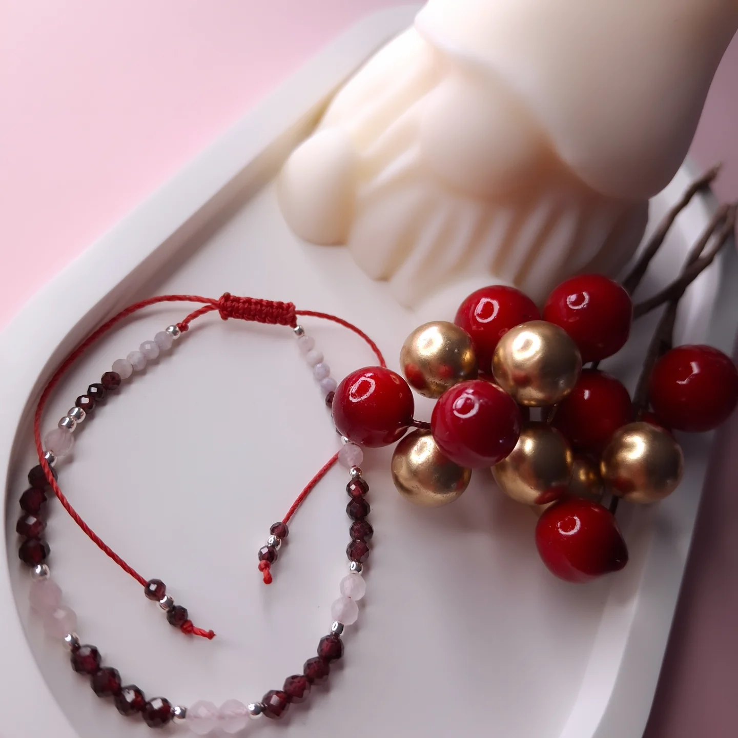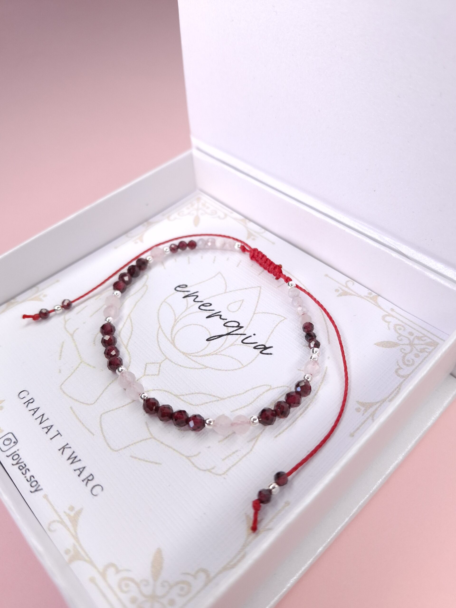 Bransoletka wykonana jest na sznurku z regulowanym zapięciem,