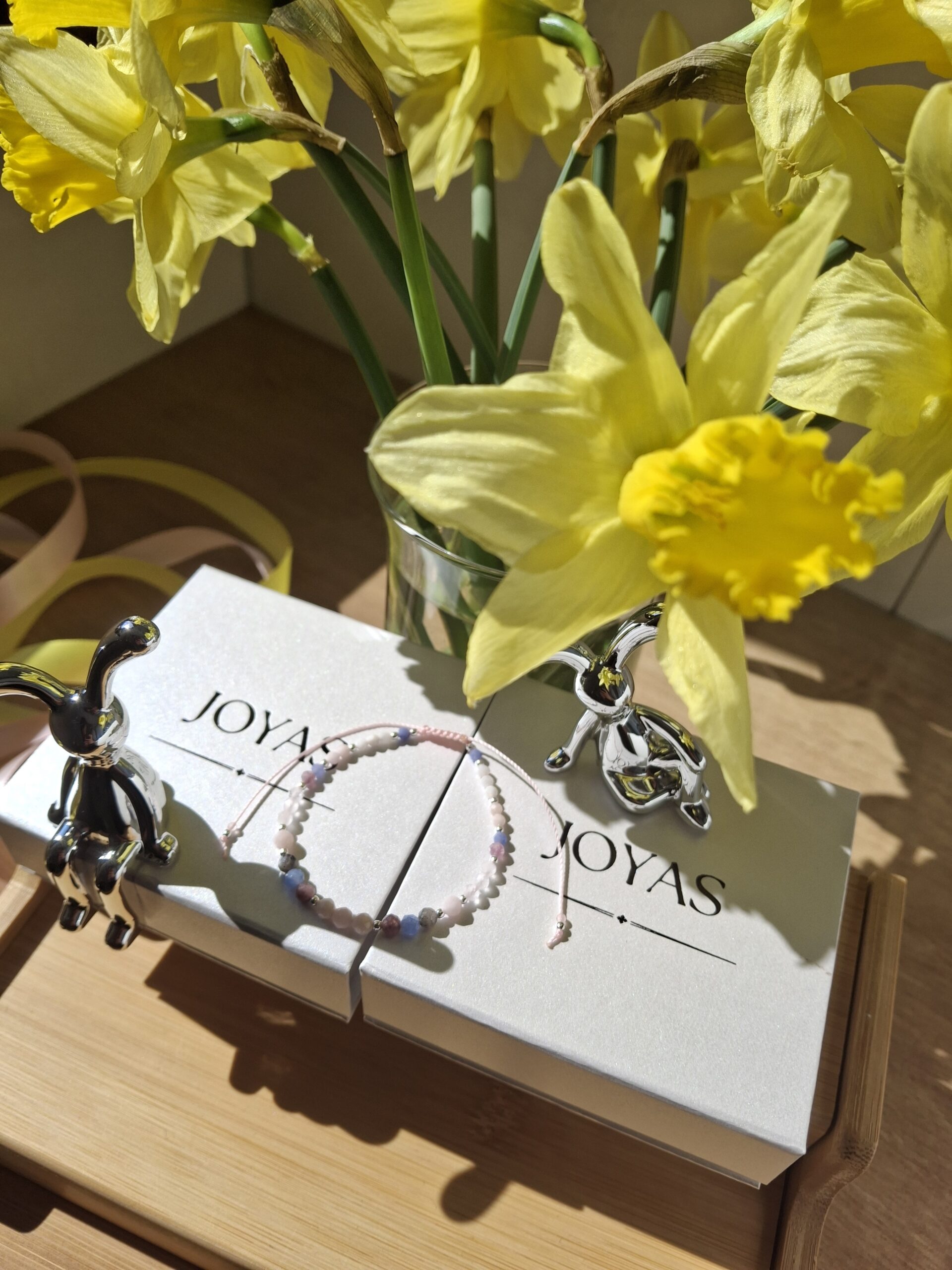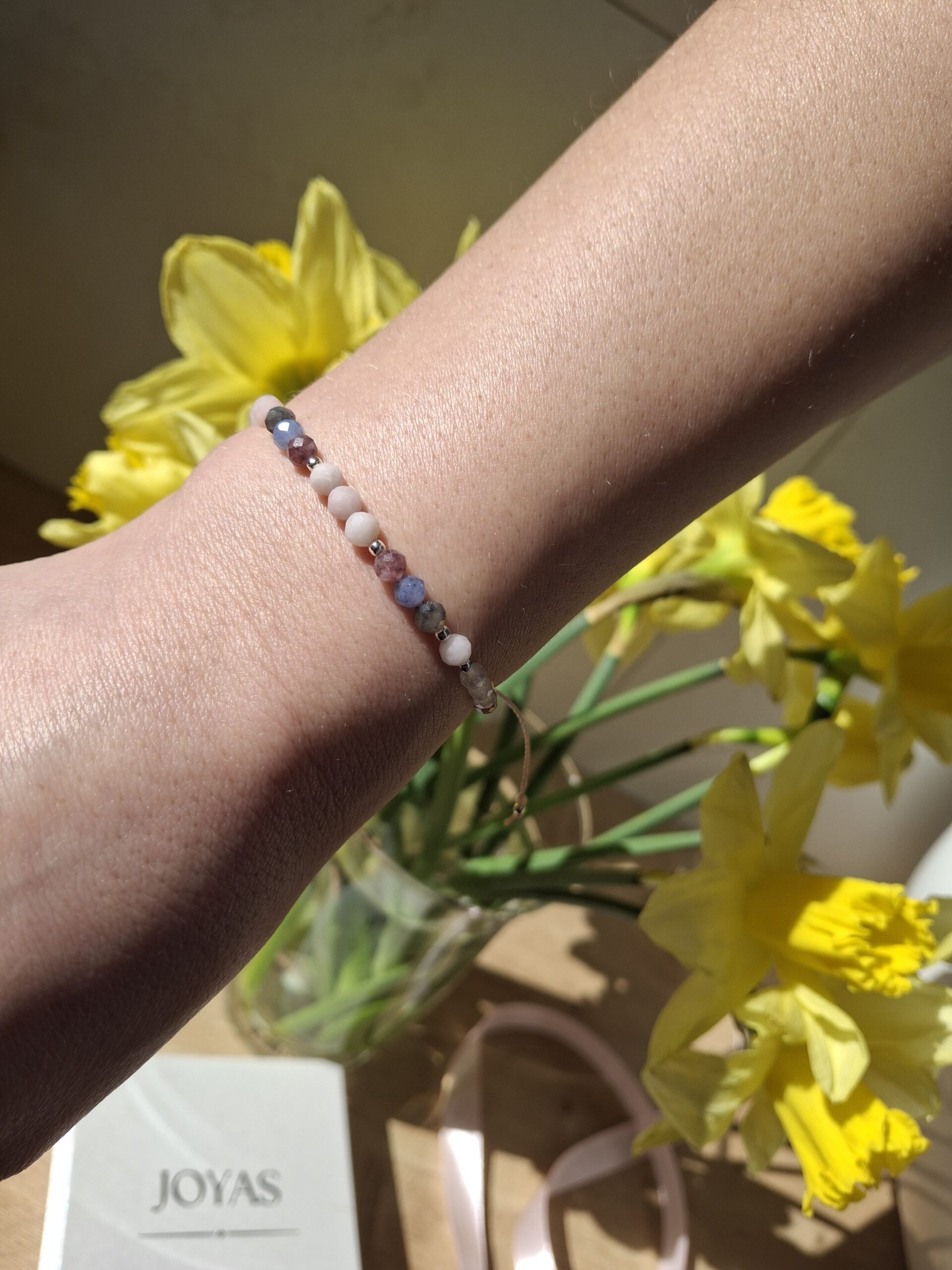 Bransoletka wykonana jest na sznurku z regulowanym zapięciem, dzięki czemu łatwo dopasowuje się do nadgarstka.