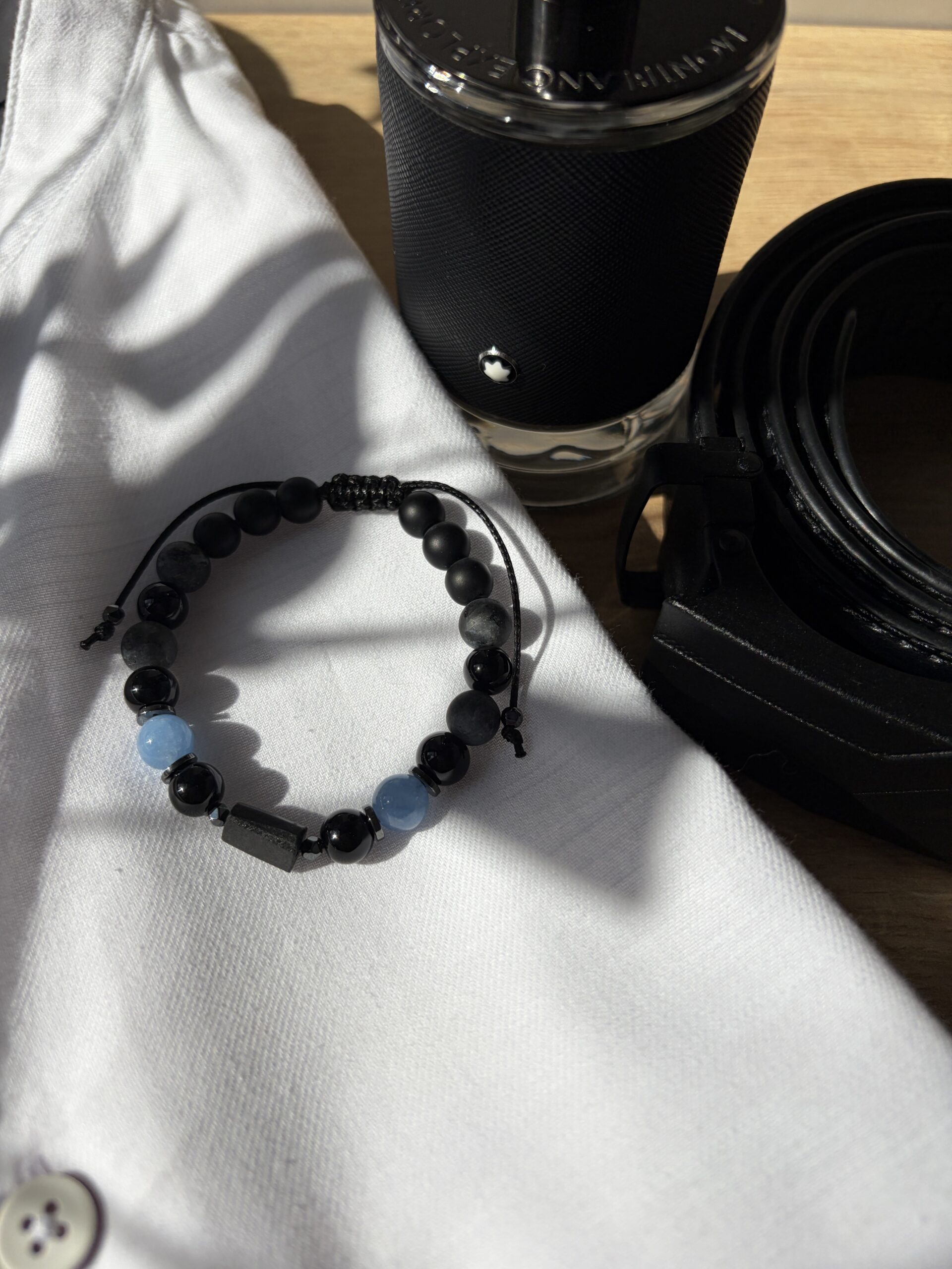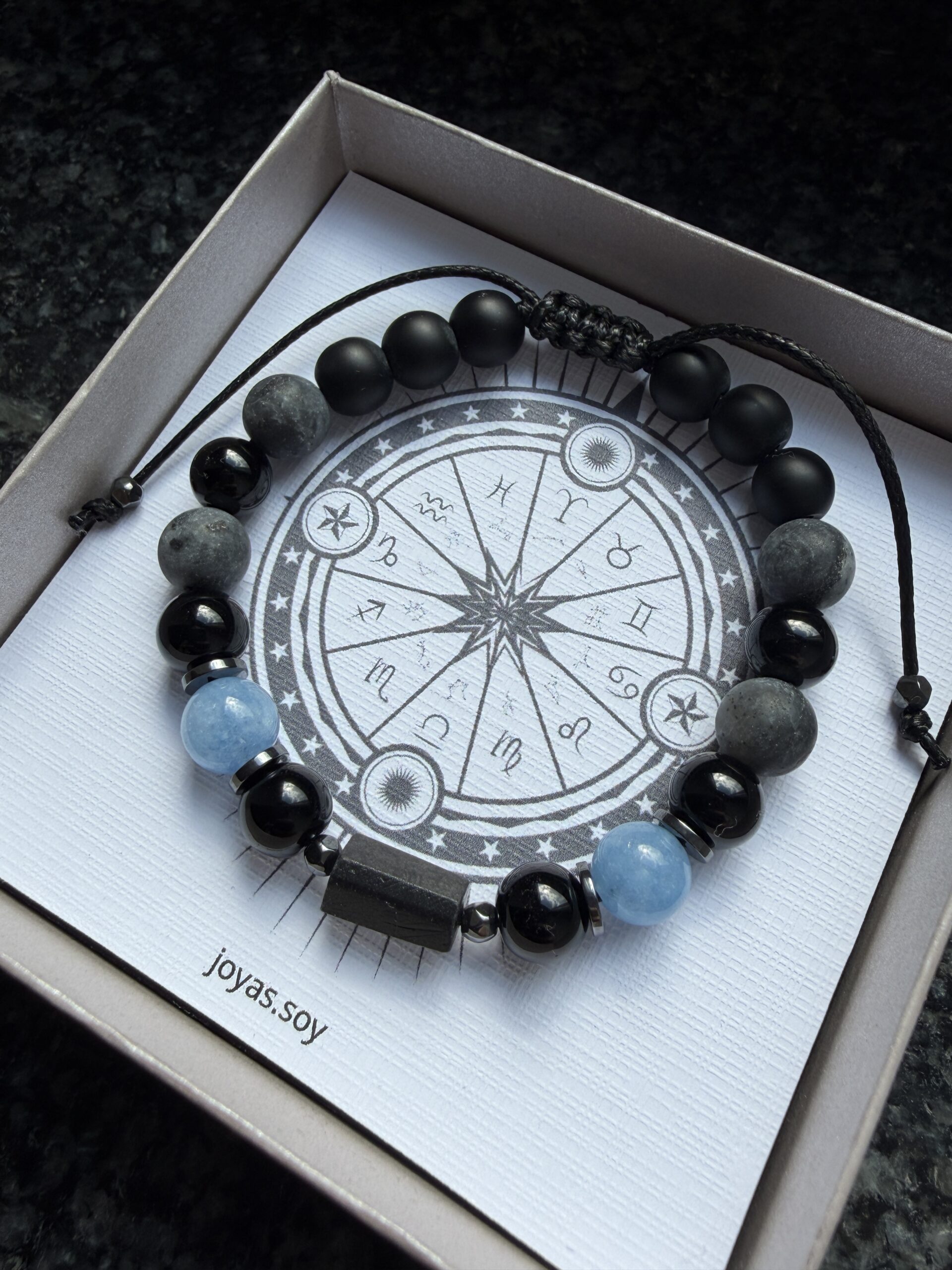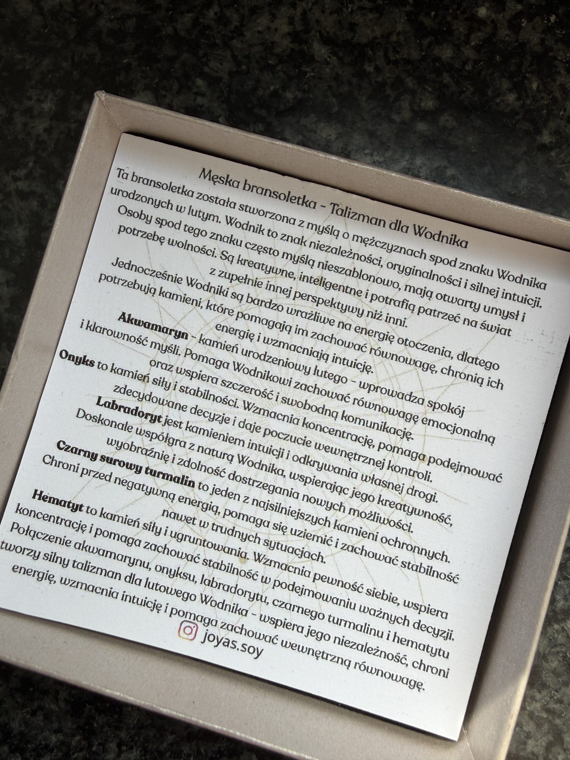 Męska bransoletka – Talizman Intuicji i Ochrony dla Wodnika z czarnym surowym turmalinem, akwamarynem, onyksem, labradorytem i hematytem. To wyjątkowy talizman równowagi, intuicji i energetycznej ochrony, który pomaga zachować jasność myśli, wzmacnia niezależność i chroni przed negatywną energią, wspierając Wodnika w podążaniu własną, niepowtarzalną drogą.