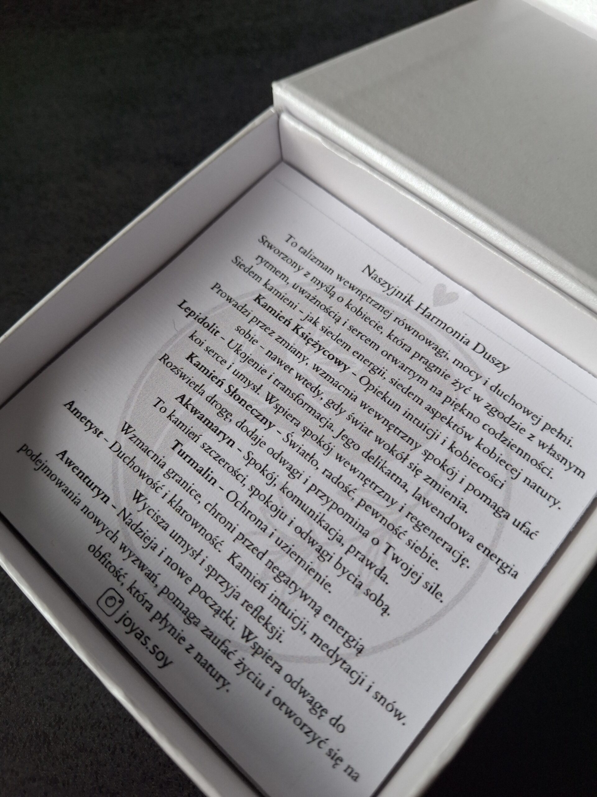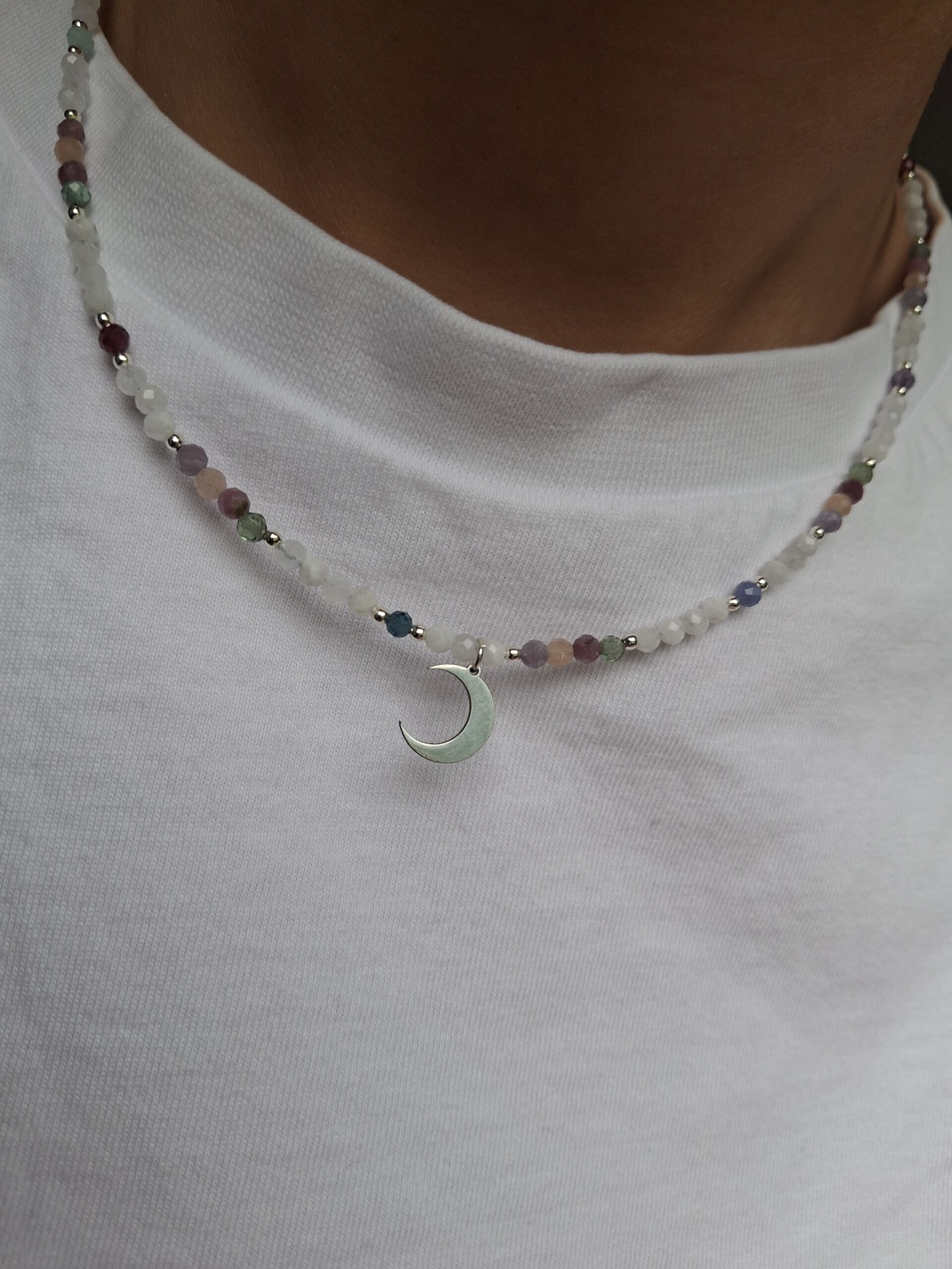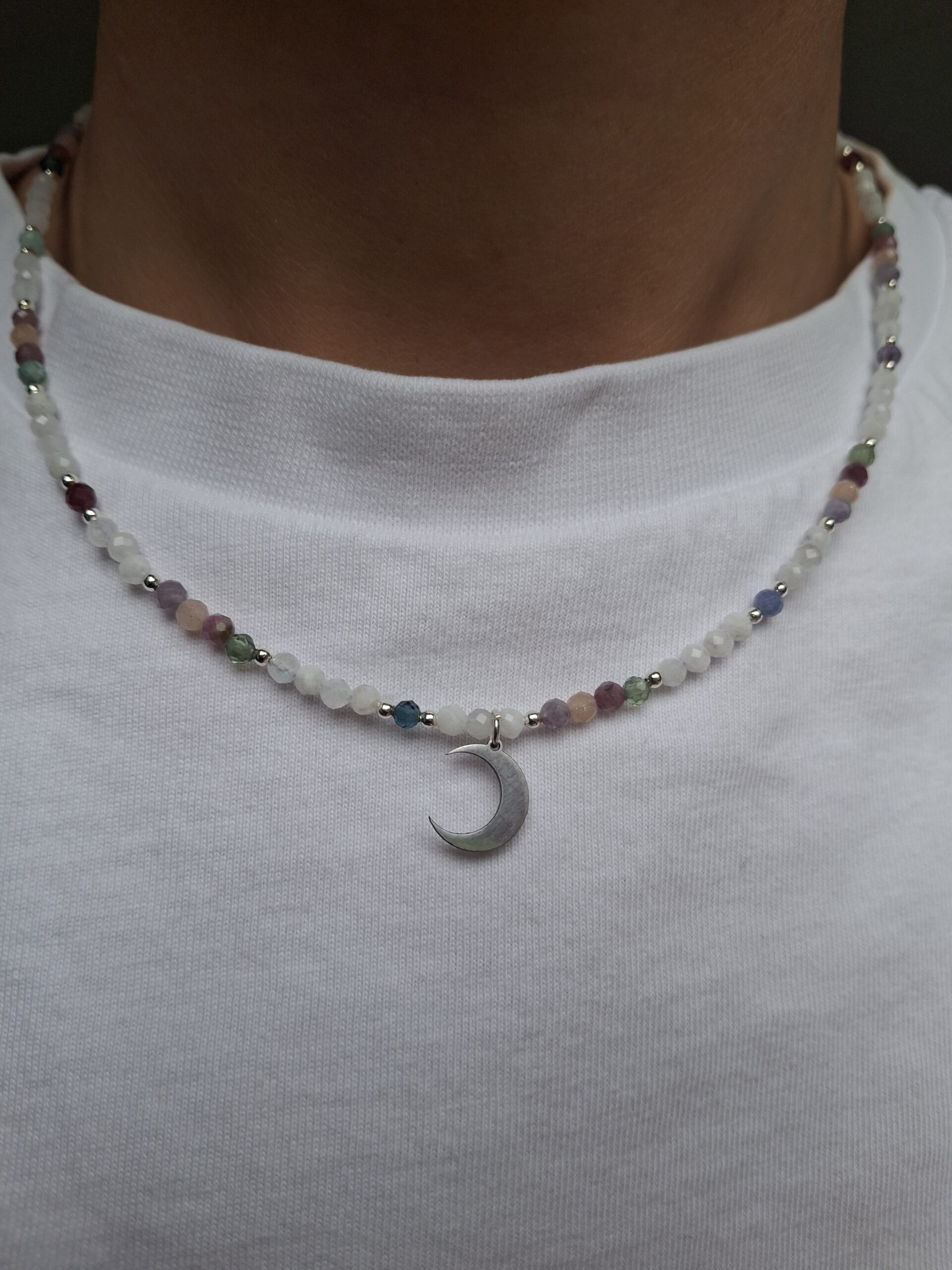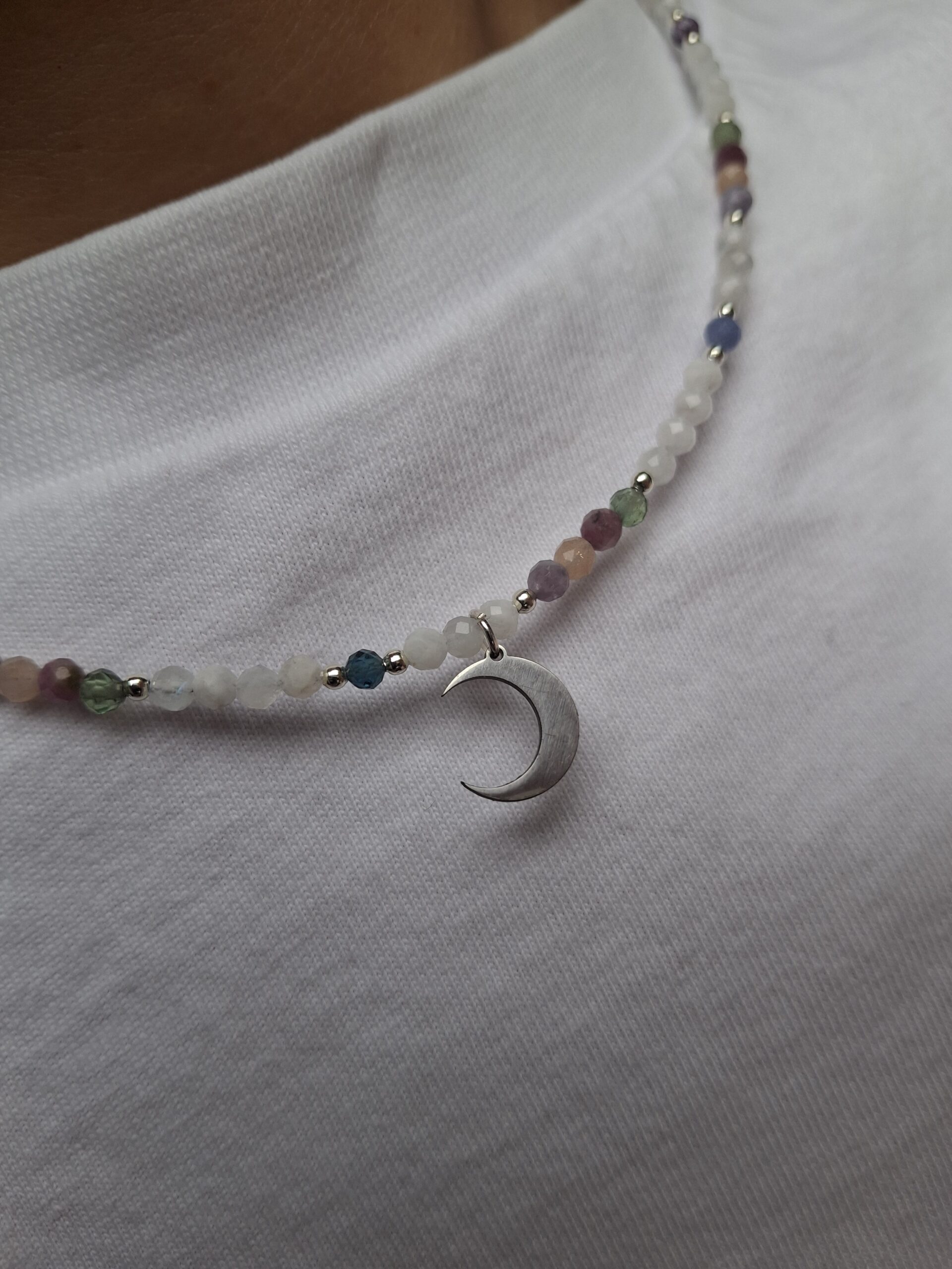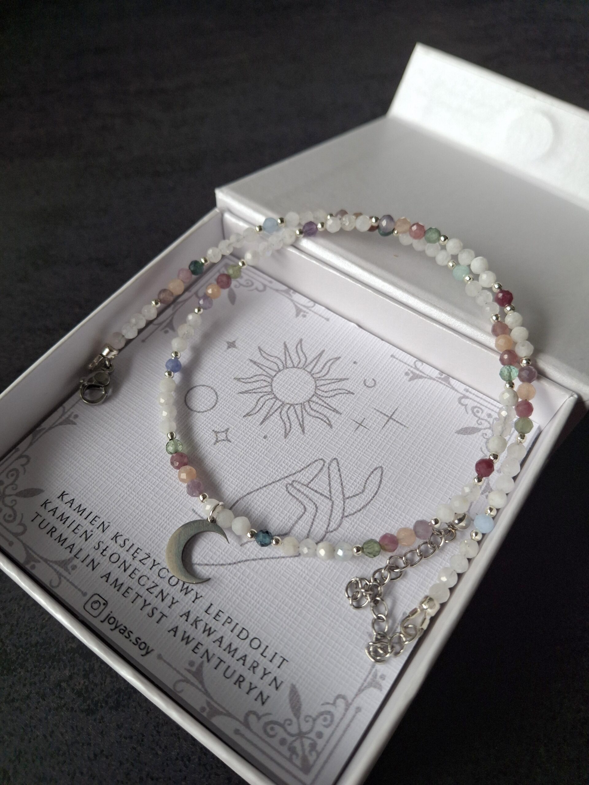 Naszyjnik Harmonia Duszy z kamieniem księżycowym, lepidolitem, kamieniem słonecznym, akwamarynem, ametystem, turmalinem i awenturynem – talizman równowagi, spokoju i wewnętrznego światła. Łączy energię intuicji, radości i miłości, przywracając harmonię serca, umysłu i duszy.