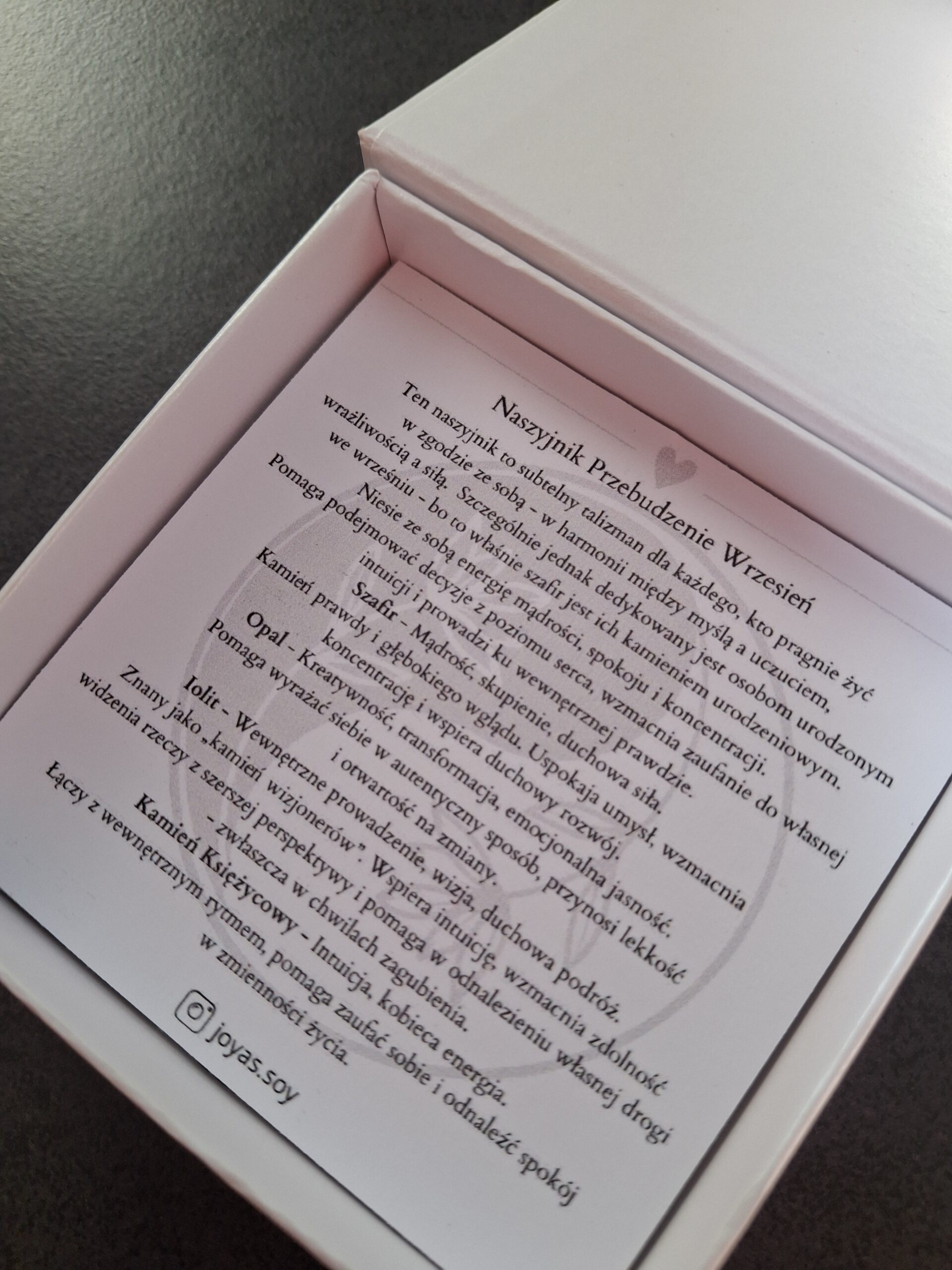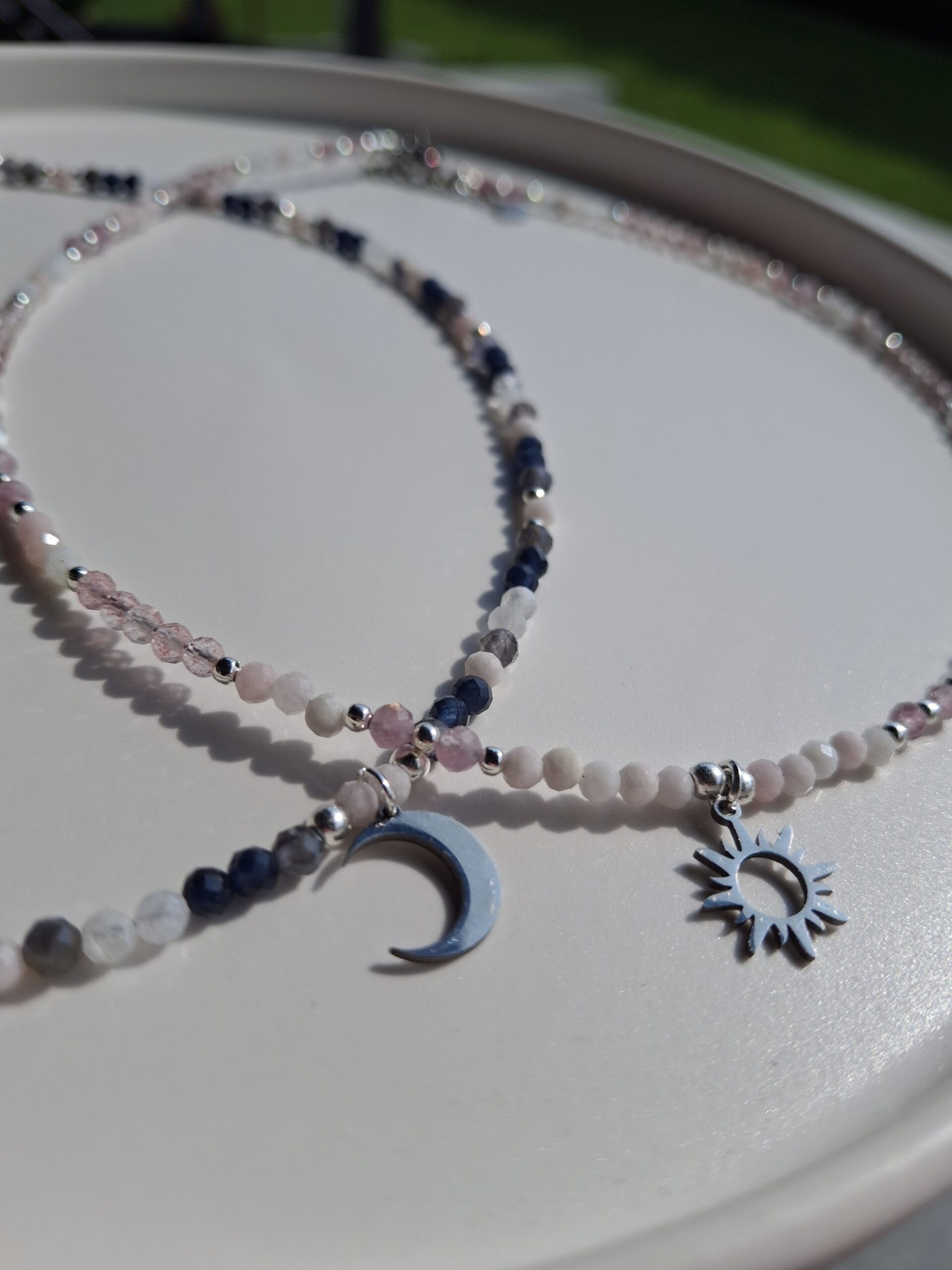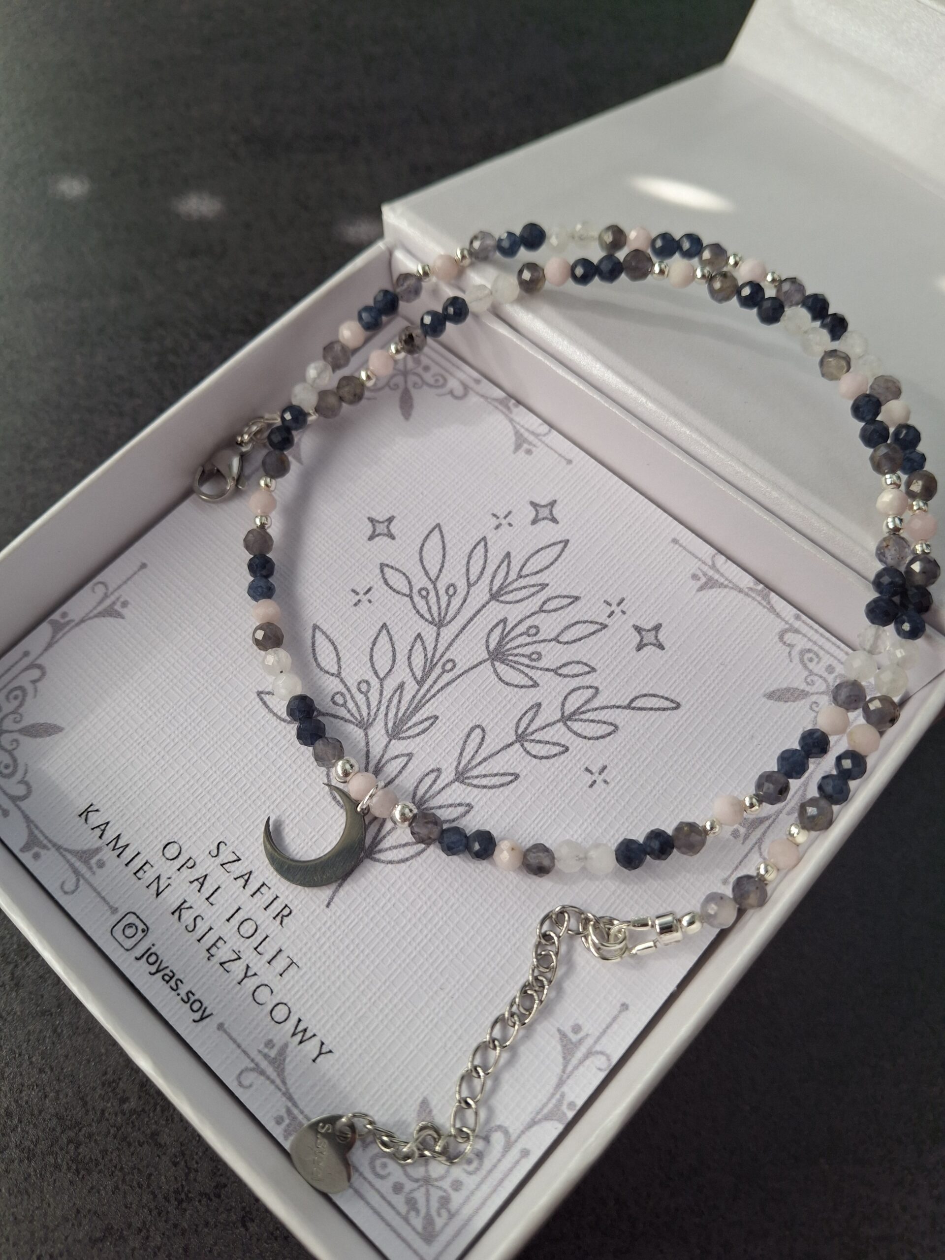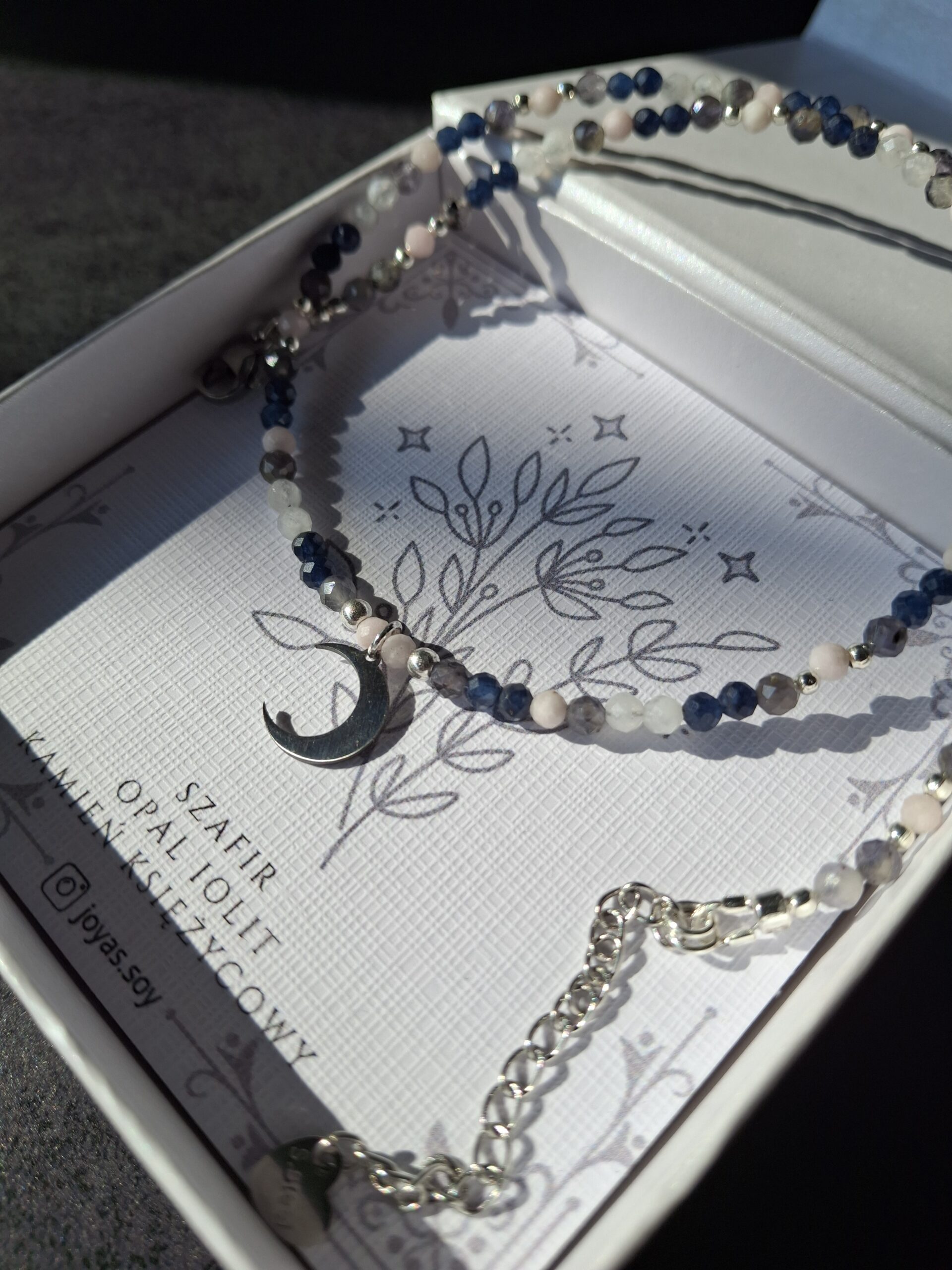 Naszyjnik Przebudzenie Wrzesień z kamieniem urodzeniowym września – szafirem oraz opalem różowym, iolitem i kamieniem księżycowym – talizman mądrości, intuicji i delikatnego odrodzenia. Łączy energię spokoju, miłości i wewnętrznego światła, wspierając w odkrywaniu nowych ścieżek i zaufaniu do własnego serca.