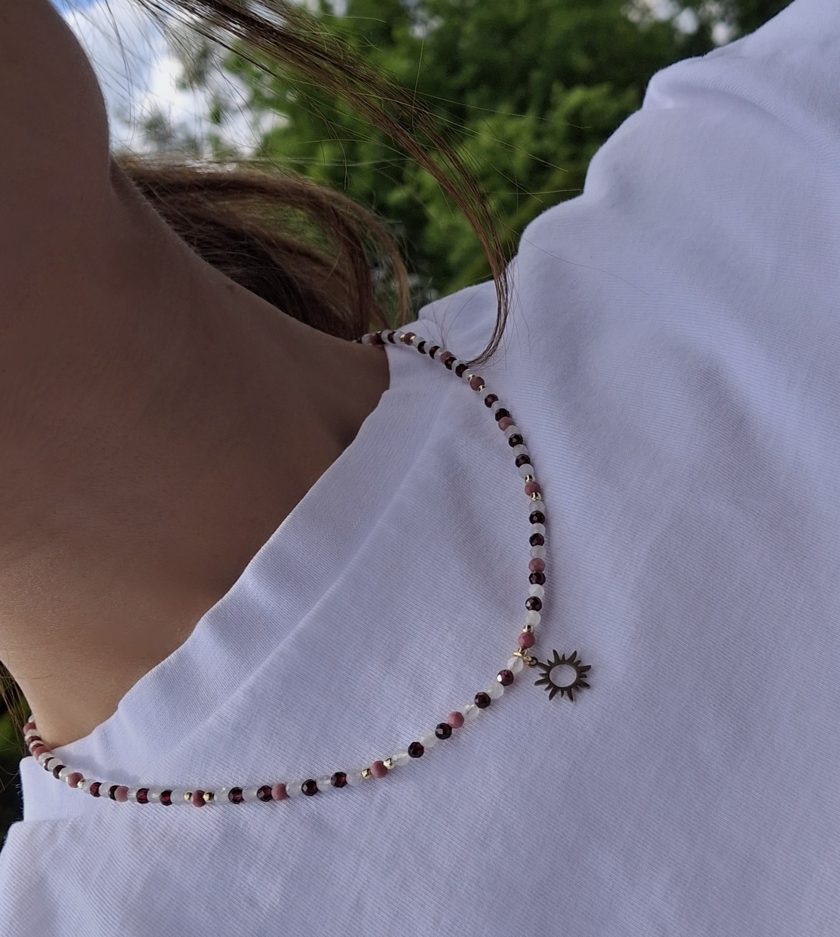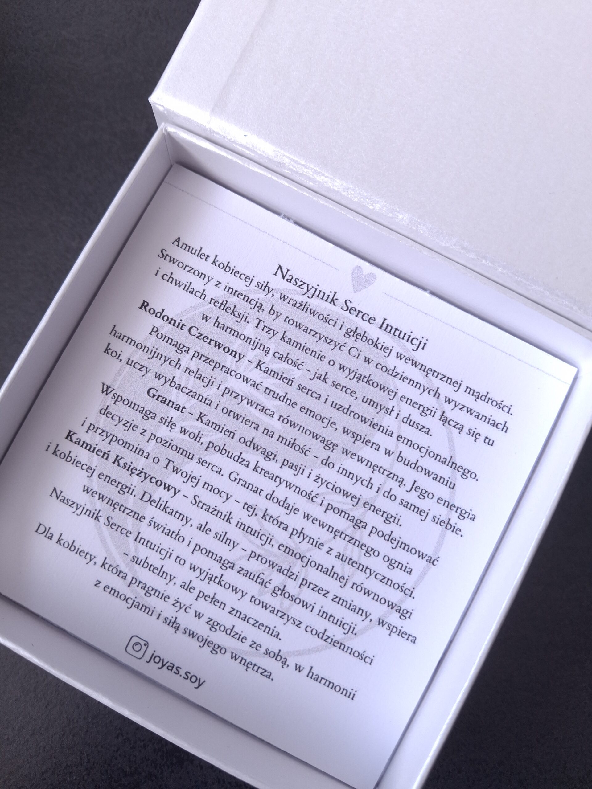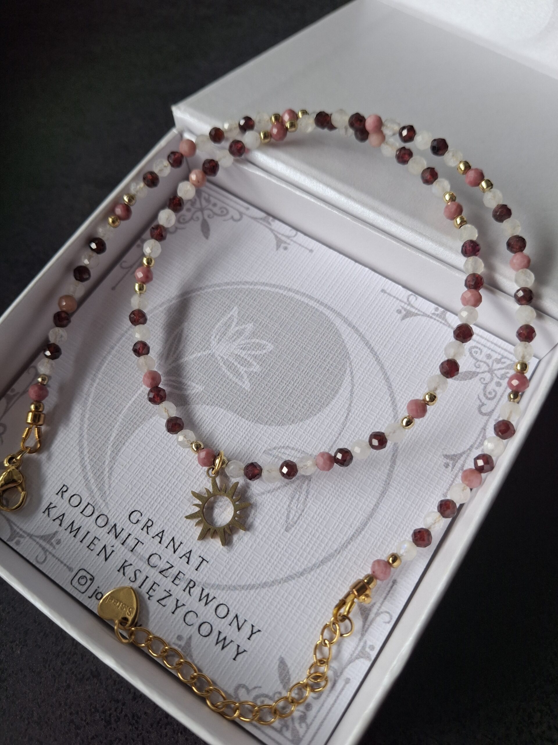 Naszyjnik Serce Intuicji z czerwonym rodonitem, granatem i kamieniem księżycowym – symbol połączenia siły serca z mądrością duszy. Wspiera odwagę, emocjonalną równowagę i zaufanie do własnej intuicji.