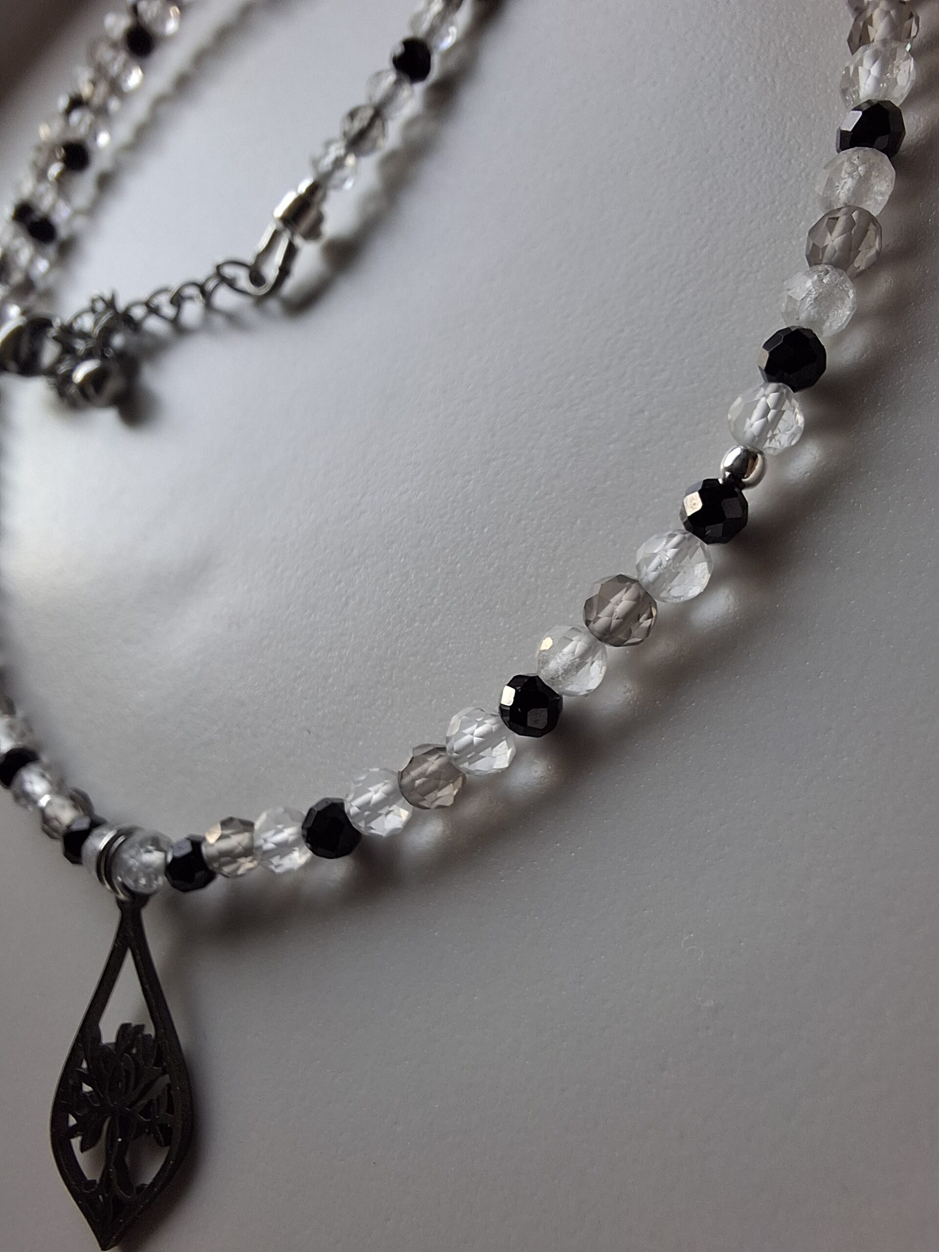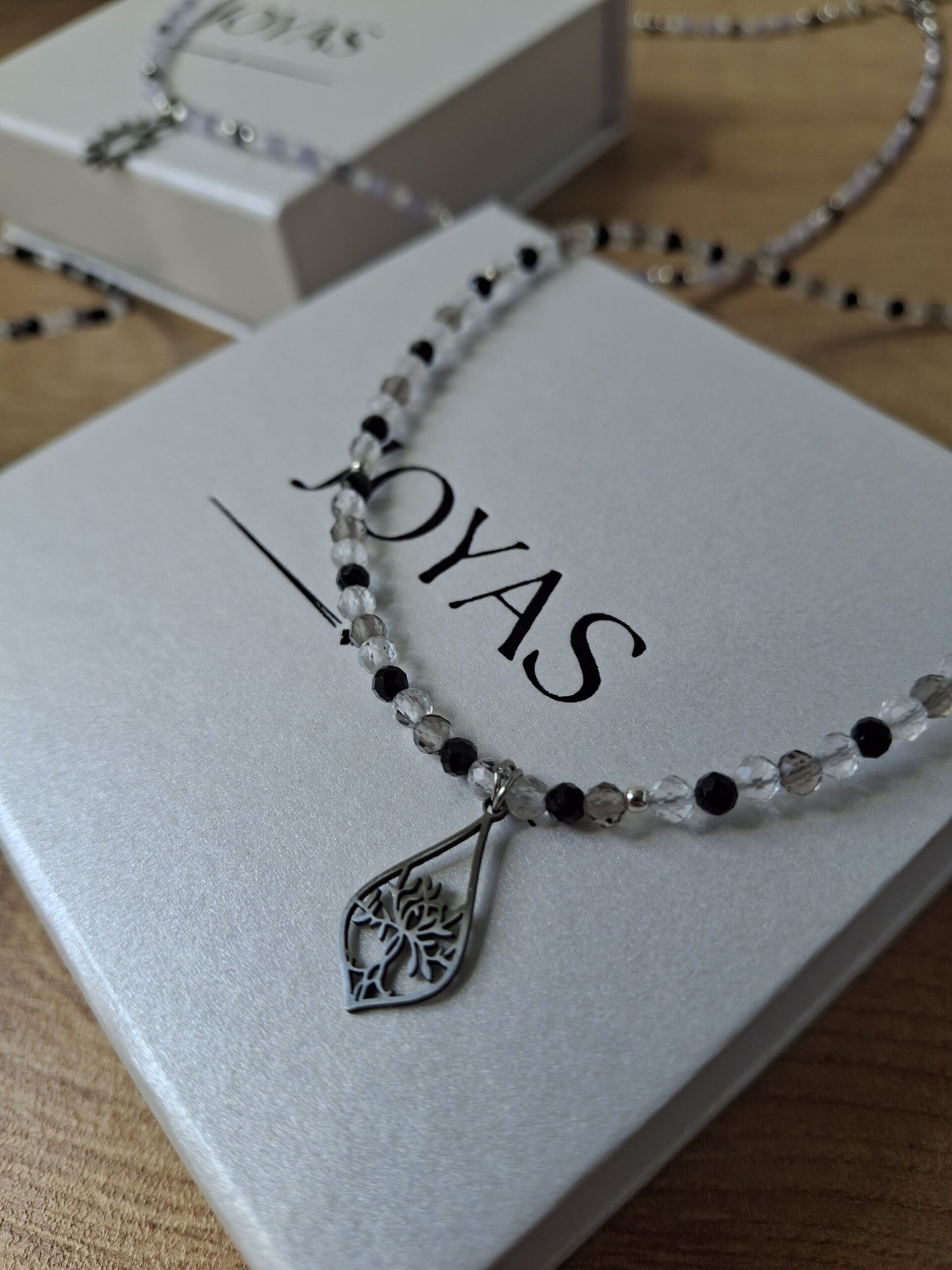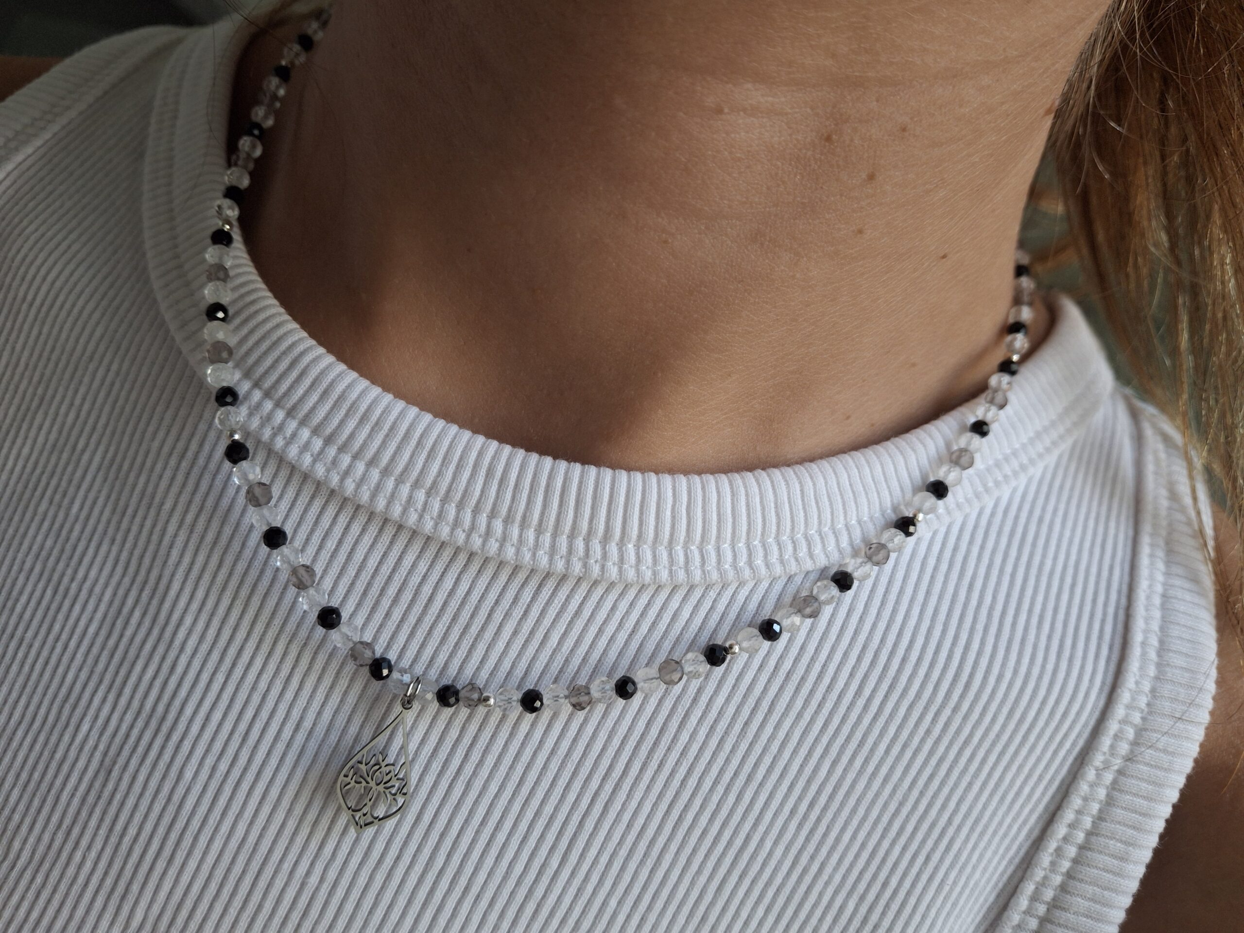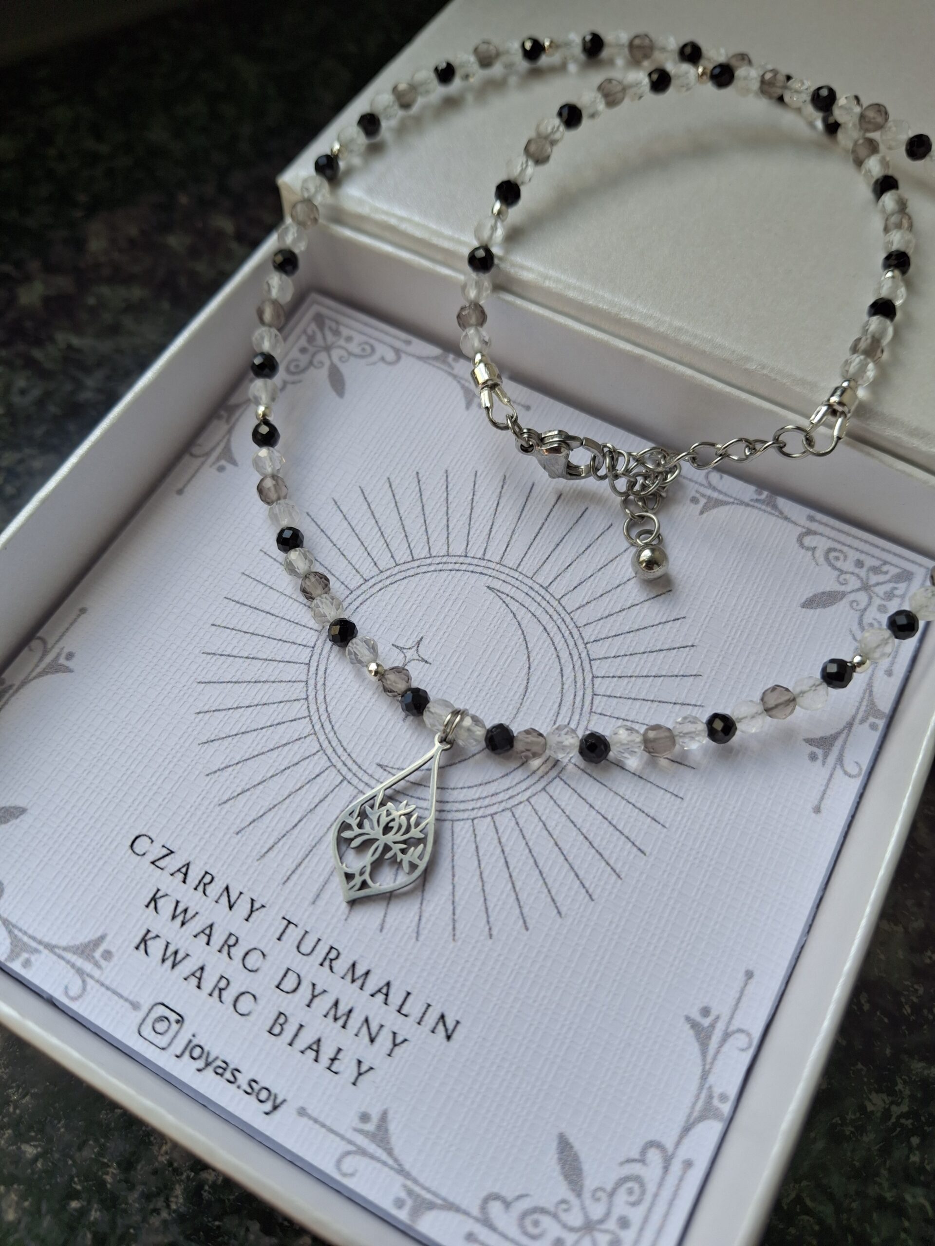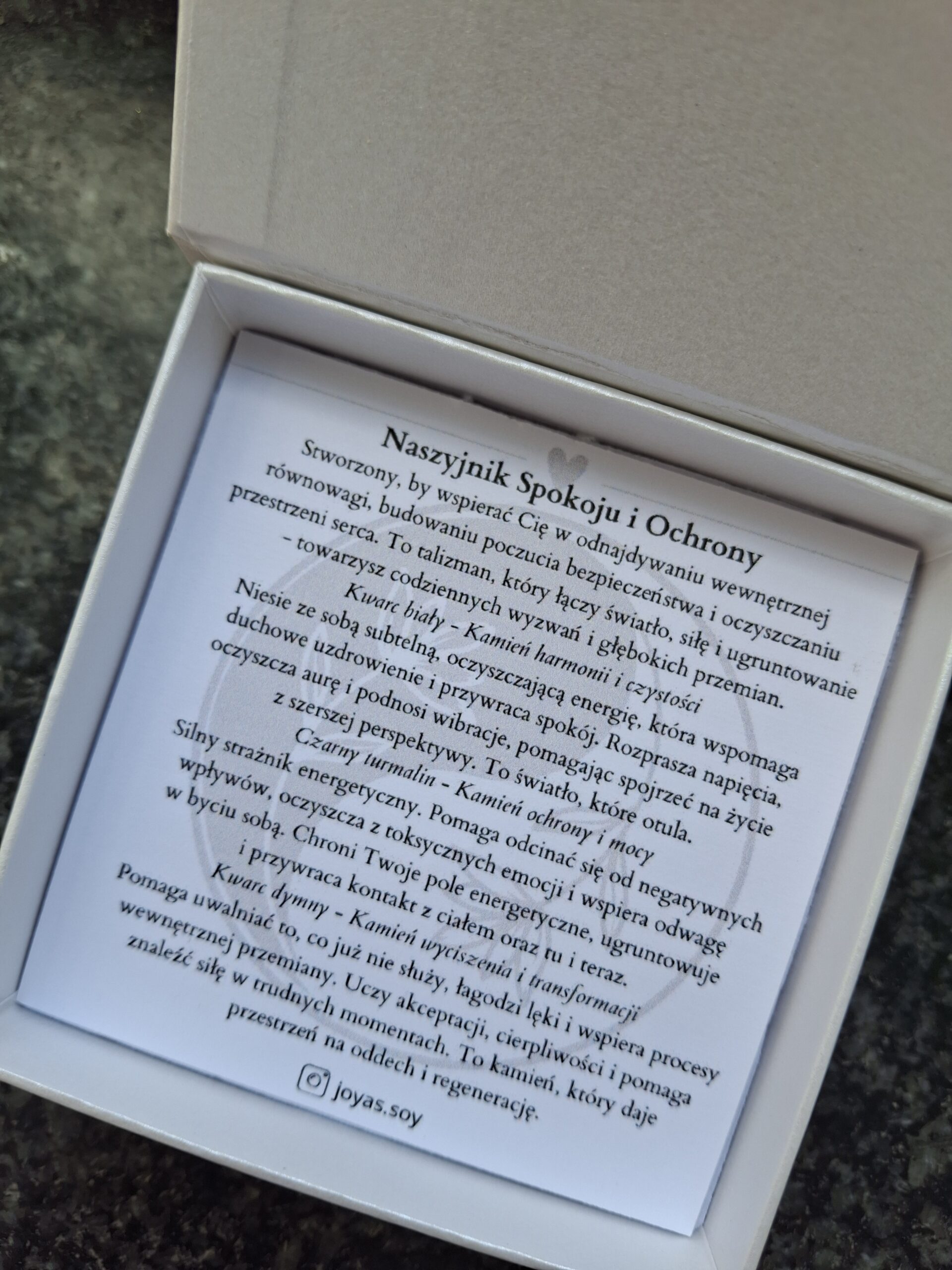 Naszyjnik Spokoju i Ochrony z białym kwarcem, czarnym turmalinem i kwarcem dymnym – harmonijne połączenie oczyszczenia, uziemienia i wewnętrznego spokoju. Wspiera równowagę emocji, chroni przed negatywną energią i pomaga zachować jasność umysłu.