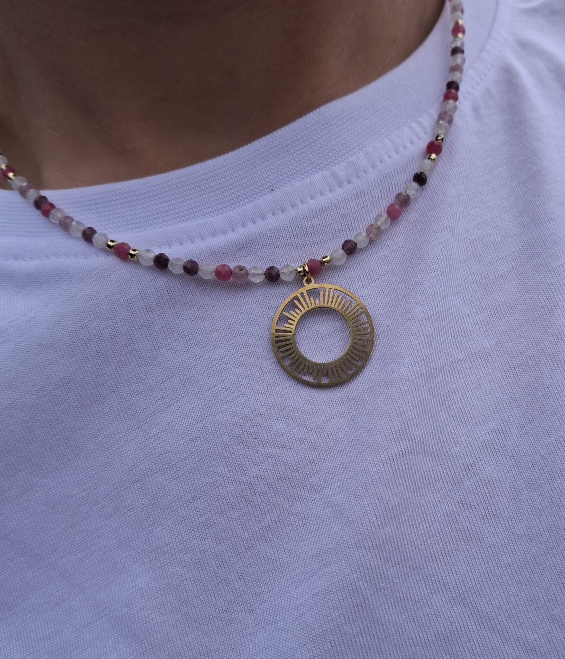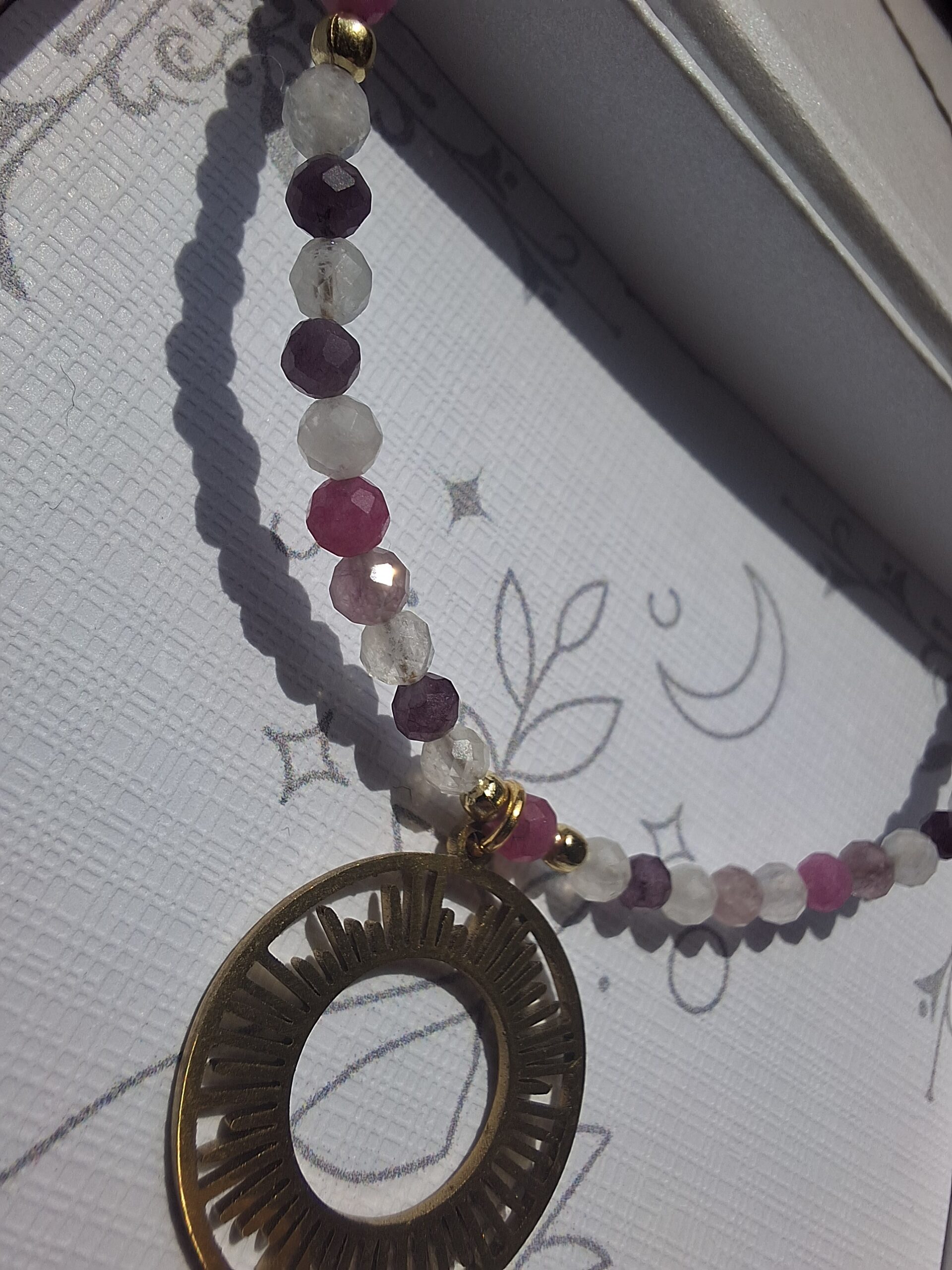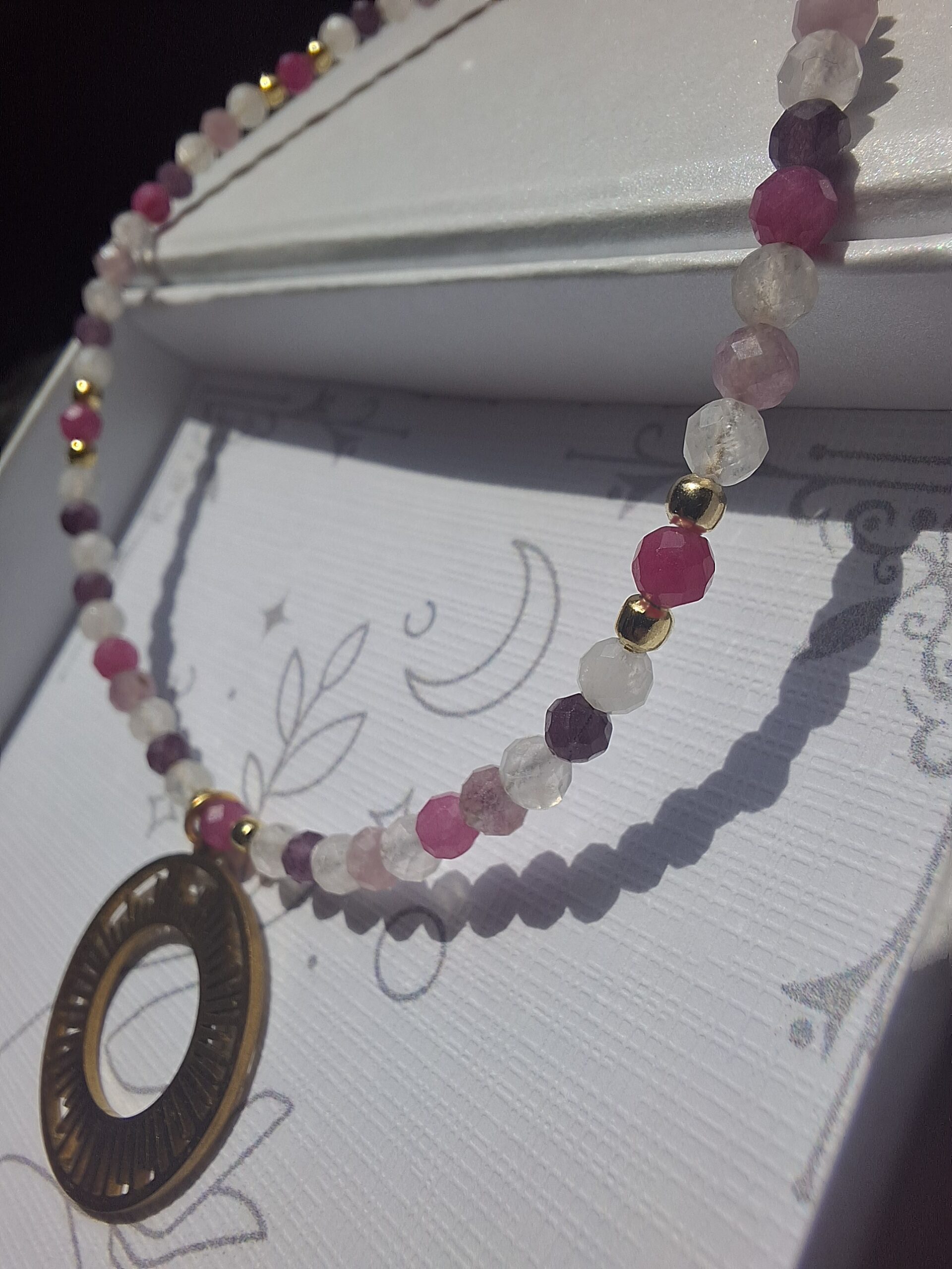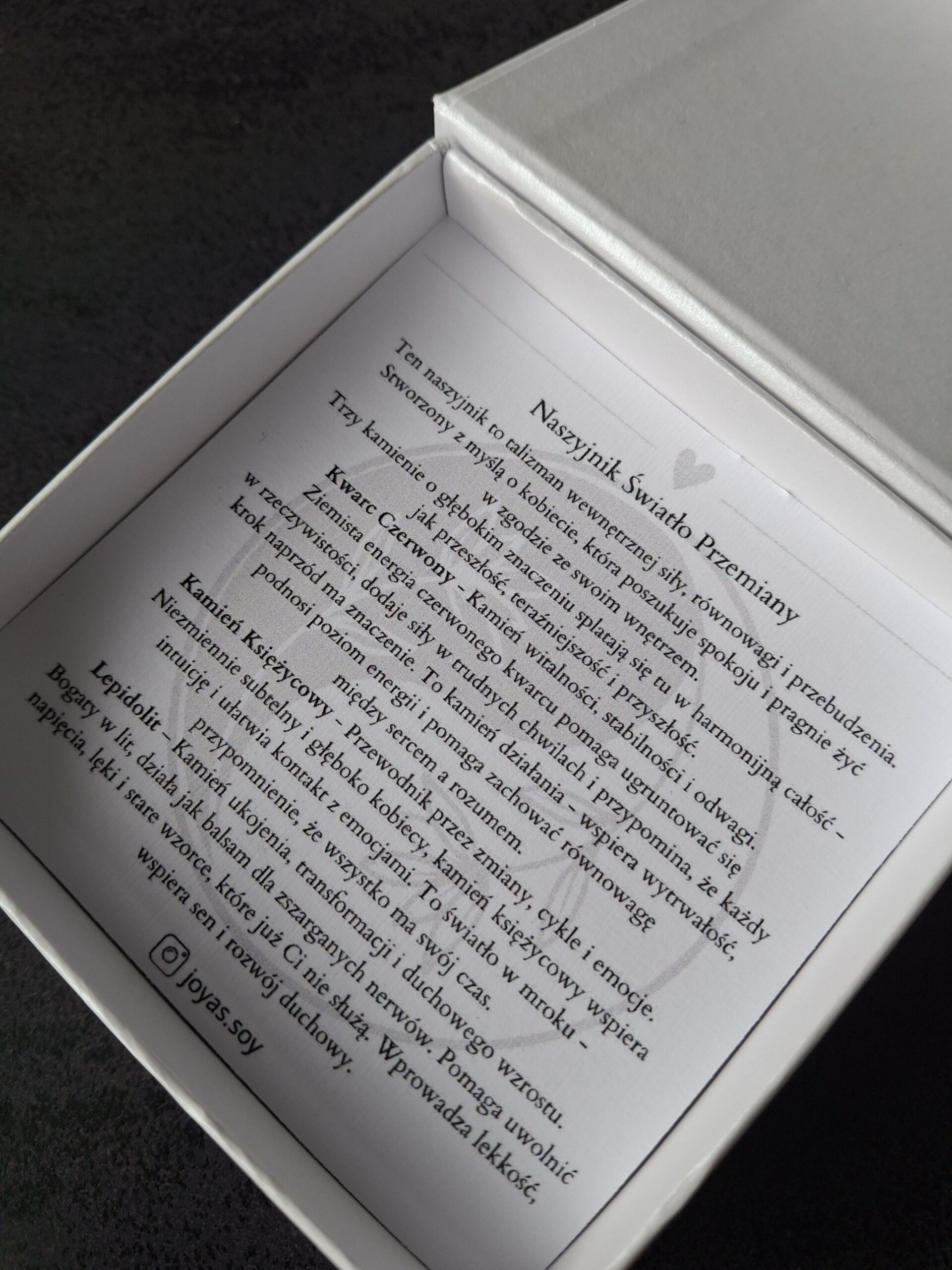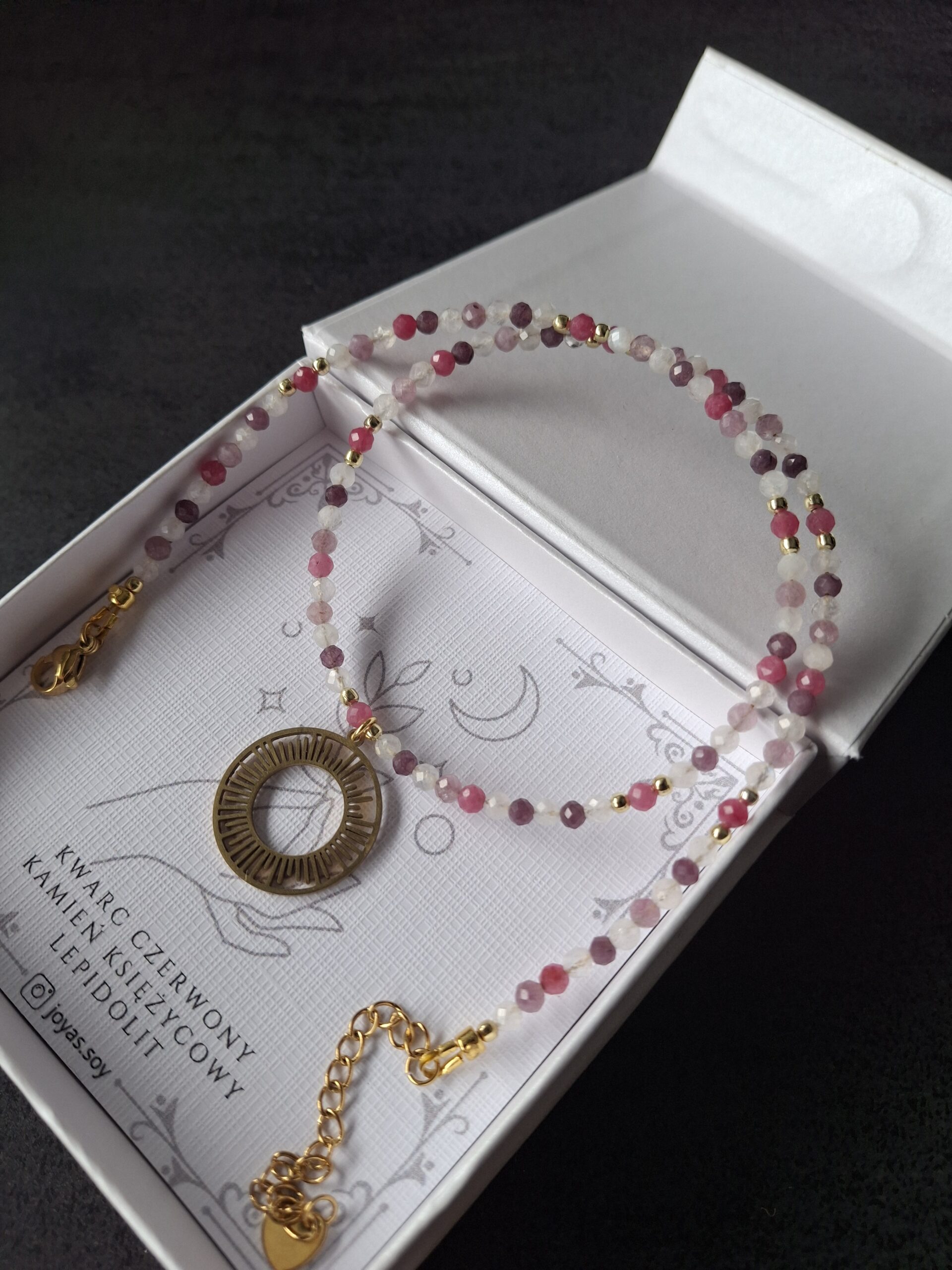 Naszyjnik Światło Przemiany z czerwonym kwarcem, kamieniem księżycowym i lepidolitem – talizman wewnętrznej siły, spokoju i odnowy. Wspiera w procesie zmian, pomaga zaufać intuicji i z odwagą kroczyć nową drogą życia,